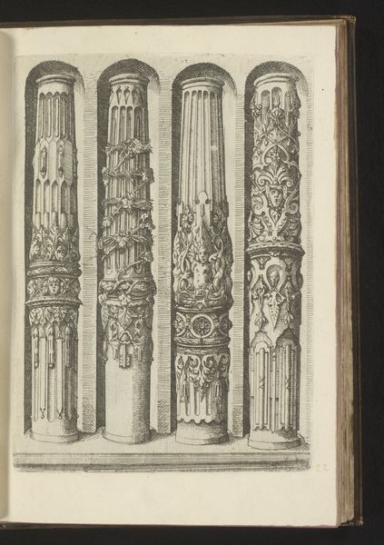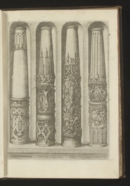 Curator: Here we have a 1565 engraving by Johannes or Lucas van Doetechum, titled "Twee 'columnae caelatae', in de Korintische en Composiete Orde" - which roughly translates to 'Two engraved columns in the Corinthian and Composite Orders'. Editor: Immediately striking! All that fine, etched detail makes the columns feel almost alive, like botanical illustrations climbing towards the sky, except they're rendered in this precise, architectural way. Curator: Precisely. It's fascinating how these classical orders, which defined so much of Renaissance architecture, are presented here. The engraving really focuses on the decorative elements. Editor: Definitely. You almost forget their function! It's a catalog entry showing off skill and craft as a trade sample; the drawing captures that skill as a process of design and documentation that serves an artist and an audience. And note the medium itself; this wasn’t some fleeting sketch, engraving allowed for copies to be disseminated and the details poured over. Curator: It feels as though the intention of this image lies as much in its intricate patterns as in any deeper metaphorical content. In my view, there’s something joyous about the craftsmanship that the design elements celebrate and showcase, so confident. It allows for almost endless imaginative engagement. Editor: I think so. The production and dissemination of knowledge is equally present here: line, paper, press, labor! It prompts us to question the social dynamics embedded in art production and how systems influence form. There's so much complexity happening even with seemingly simple columns. Curator: Perhaps in their original setting, their intricacy became one element within a whole of colors, materials, and light. A single frame in an intricate machine, like this single sheet in the larger architecture textbook or pattern book. I feel my mind trying to conjure their original location and it comes up blank! Editor: Right. As artifacts mediating time and place, this artwork helps remind us that the physical properties of a drawing itself carries all this historical context.