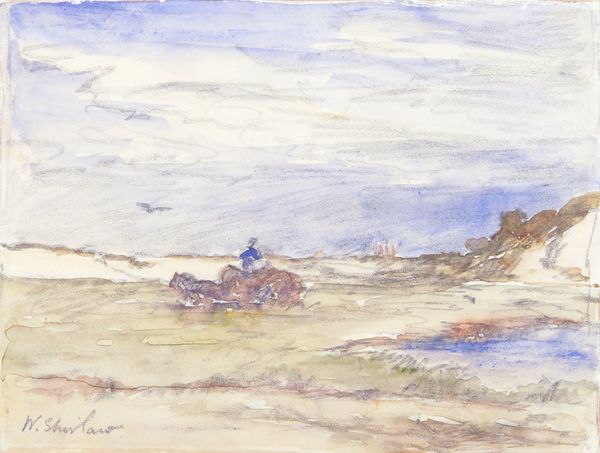Editor: This is “Duinlandschap,” or "Dune Landscape," by Johan Antonie de Jonge, made sometime between 1881 and 1927 using pastel and other dry media on paper. There's a stillness to it, a quiet vastness, despite being a smaller drawing. How do you interpret this work? Curator: It whispers of transient beauty, doesn't it? The way the pastel captures the light dancing across the dunes… I feel a connection to the artist sketching en plein-air, wrestling with the ephemeral. It’s not just a landscape, but an emotional space. Does it evoke any personal memories or feelings for you? Editor: I guess I see it as being very simple. I mean, literally, but it sort of suggests a vastness beyond what's on the paper? Almost romantic, in a way? Curator: Absolutely. The simplicity belies a sophisticated understanding of composition and atmosphere. Look at how the artist uses subtle gradations of color to suggest depth. It resonates with the Romanticism movement, yes, in that it conveys an individual, almost spiritual experience of nature. Do you see that influence? Editor: Yes, the light does almost feel spiritual, the way it hits the dunes. Almost like a church in nature. So was De Jonge a strictly landscape artist, or were they working in a few genres? Curator: Primarily landscapes, often capturing these quiet moments in nature. De Jonge wasn’t chasing grand narratives; he seemed content finding the extraordinary within the ordinary. A reminder that beauty surrounds us, even in the most unassuming places, like this sketch, perhaps? Editor: I see what you mean. It does kind of force you to find the beautiful in the everyday. Curator: Exactly. It's almost a meditative act. This work reminds us to pause, to breathe in the vastness, and to appreciate the subtleties we often overlook. It’s nice when you can find peace, even if that peace is just within a landscape, or a simple artwork. Editor: Definitely! It’s incredible how much emotion and atmosphere can be packed into such a simple drawing. Thanks for pointing that out.