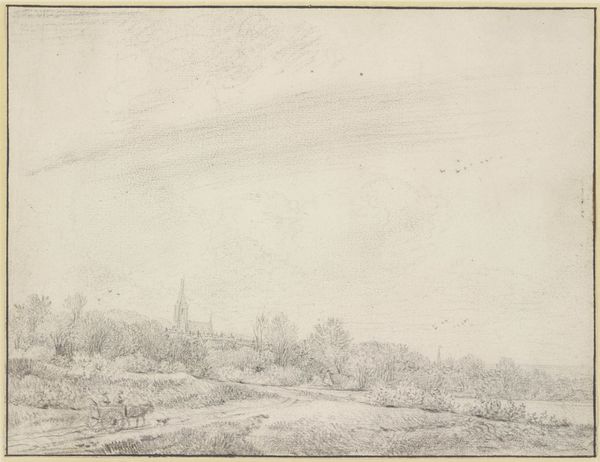 Curator: This delicate pencil drawing is entitled "Landscape with the Ponte Milvio, outside Rome" and it was created by Gerard ter Borch the Elder in 1609. What’s your first impression? Editor: It feels incredibly serene and observant. There's a vastness communicated through the simple, yet detailed rendering. But tell me, what was ter Borch Sr.’s engagement with this locale and why a seemingly mundane subject like a bridge? Curator: Ter Borch, of course, was a prominent figure within the Dutch artistic milieu, even though not often foregrounded relative to his more successful son. He spent time in Rome around this period, where, evidently, he adopted a particular method. Pencil sketches, especially landscape studies, were becoming increasingly important as a stage in the artistic process, allowing artists to rapidly document impressions and motifs. The choice of Ponte Milvio underscores the shift from idealized to observed landscapes; it is rendered less as a symbolic location than as part of the material environment, almost. Editor: This piece speaks to broader historical narratives of power and transit that shape communities. The Ponte Milvio wasn't just any bridge, was it? Ancient roots, crucial Roman artery, even witnessed a pivotal battle that solidified Christianity. I wonder how those echoes shaped Ter Borch's rendering of it—how did it resonate within its layered cultural, religious, and colonial history? Curator: Exactly, to understand fully, we can’t detach the bridge's structure and function from the economic flows it once facilitated. Note, for instance, the level of detail invested in depicting fields in the immediate foreground, each section marked with subtle variation of light. And pencil allows this subtlety; we get linear hatching delineating plots and topographical undulation—visible and tangible labor through mark-making. Editor: And those topographical details hint at how land is used, organized and claimed—it underscores material ownership and production and extraction, reflecting how rural agrarian landscapes relate to the socioeconomic context of seventeenth-century Rome. It is not, though, entirely topographical accuracy that Borch is after, wouldn’t you say? Curator: Certainly, it's not a precise topographical survey, nor an idealized vista. The pencil sketch captures lived engagement between artist and environment within broader historical and cultural forces shaping perception and visual representation. Editor: I see in the careful strokes the complexities and histories embedded in a seemingly quiet landscape. Curator: And I think the drawing also forces us to see that art is created through a complex mesh of ideas and real working and access conditions. It urges us to appreciate what pencil sketch contributed to the artistic practice, at that moment.