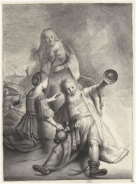 This is Jan Georg van Vliet’s etching, “Lot and his Daughters.” It illustrates the biblical tale of Lot, fleeing the destruction of Sodom. Observe Lot, drunkenly unaware as his daughters ply him with wine. This motif of intoxication and hidden truths recurs throughout art history. Think of the Bacchanalian scenes of classical antiquity, where wine unveils primal instincts. The cup, here a symbol of both comfort and deception, echoes in countless works, from Caravaggio’s opulent feasts to cautionary tales of excess. Consider, too, the psychological weight of this scene. The daughters’ gestures—one offering wine, the other looking back towards the burning city—speak to a primal instinct for survival and the complex moral compromises born of desperation. This image taps into our collective memory, reminding us of the blurred lines between victim and perpetrator. It also stirs deep-seated fears about the disintegration of social order and the collapse of moral boundaries in times of crisis. As we trace the path of this scene through time, we see how the cup—as a symbol of temptation, oblivion, and hidden knowledge—continues to resurface, evolving and adapting to each new era, each new telling.