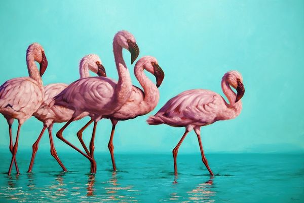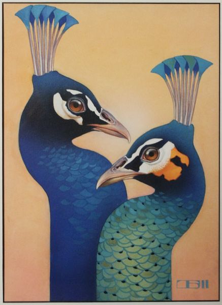 Editor: Eckart Hahn's "Hypnotic 60°," created in 2013 with acrylic paint, strikes me as wonderfully odd. The birds against that sharp yellow backdrop… it's almost unsettling, yet vibrant. What do you make of this piece? Curator: Hahn's work is fascinating, especially considering his persistent use of animals, figures and geometric backdrops. In a Jungian sense, consider these avian figures not merely as birds, but as symbols within our collective unconscious. What do these particular birds evoke for you? Editor: The swan, definitely elegance, maybe a bit of darkness because it’s black. The other bird, a heron I think, feels more…grounded? Is there a historical context to how birds are portrayed in art? Curator: Absolutely. Birds have carried symbolic weight across cultures for millennia. The swan, for instance, has been linked to grace and transformation but, given its color, potentially melancholia, even death. The heron, often associated with patience and observation, and this little bird gives off energy. Hahn creates a dialogue between these archetypes. How does that geometric backdrop alter your perception? Editor: It adds a sense of artificiality, like this isn't a natural scene at all, and I guess highlights the surrealism element? I like that it adds to the feeling that these creatures may signify a symbolic element more so than existing only in the physical world. Curator: Precisely. Hahn masterfully utilizes realism with surreal elements. This tension asks us to consider what we think about what these animals truly represent – whether from our history or memory. Editor: This has changed my perspective so much! The depth of symbolism layered within this vibrant composition is truly mesmerizing. Curator: And Hahn's enduring work reminds us of how powerful, complex, and enduring cultural symbols are.