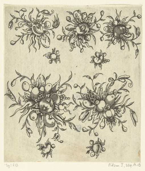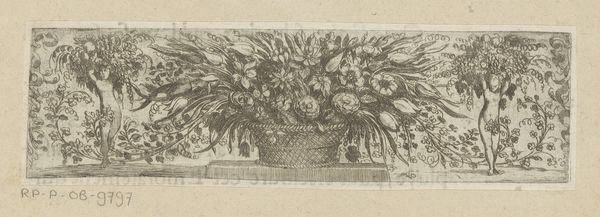 Editor: This is "Festoen van vruchten, bladeren en bloemen" or "Garland of fruits, leaves and flowers", created in 1699 by Friedrich Jacob Morisson using pen and ink. The meticulous detail almost gives it the quality of an engraving. What first catches my eye is the tension between the controlled, almost scientific rendering, and the abundance of the natural forms depicted. What stands out to you in this piece? Curator: The garland form is so much more than just a decoration. Look closely—the individual elements speak volumes. The fruits and flowers are, of course, emblems of prosperity and the fleeting nature of earthly pleasures, a common memento mori. But consider the placement, the careful arrangement. What does it tell you? Editor: It feels…intentional, balanced, yet also spilling over with life. The ribbons at either end add a celebratory, decorative feel, framing that central cluster of produce. Is this a purely celebratory piece, or something more layered? Curator: Think about the period – late 17th century. The Baroque loved the dramatic and the opulent, but always with underlying meaning. Each fruit, each flower, carries symbolic weight, often religious or allegorical. Even the precise rendering, using line technique so prevalent during that era, points to a desire to classify, understand, and ultimately control nature itself. Where do you see that idea of control manifested in the artwork? Editor: Maybe it’s in how the organic forms are so clearly defined by those strong lines, making everything distinct and readable. It feels like an attempt to capture and freeze a moment of perfect ripeness and plenty, like pressing flowers. Curator: Precisely. The garland as a symbol becomes a vessel containing encoded cultural meanings about abundance, mortality, and our relationship to the natural world, doesn’t it? Editor: Absolutely! I didn't realize just how much visual symbolism was packed into what initially seemed like a purely decorative drawing. Thank you!