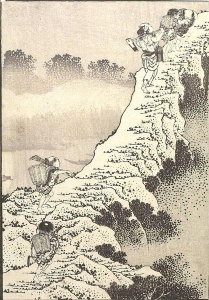 Editor: This woodblock print, "Fuji with a Belt," by Hokusai, part of his *One Hundred Views of Mount Fuji*, presents a striking scene. The monochrome palette and dynamic composition with the ox crossing the bridge create a sense of rustic energy. What can you tell us about how this image was received? Curator: Hokusai’s series gained immense popularity. Consider how Mount Fuji was not only a sacred symbol but also a carefully cultivated national icon. Prints like these democratized access to this symbol. How do you think the portrayal of everyday life alongside Fuji contributed to its appeal? Editor: Perhaps it made Fuji more relatable, less of a distant ideal? Curator: Precisely. It situated the mountain within the lived experiences of the populace, reflecting a shift in the social and political landscape that embraced broader participation in cultural narratives. Editor: That’s fascinating; I hadn’t considered the democratization aspect. Curator: Understanding the socio-political context enriches our appreciation of Hokusai's work.