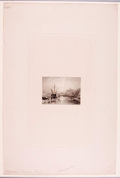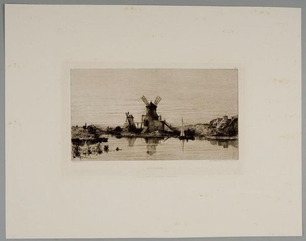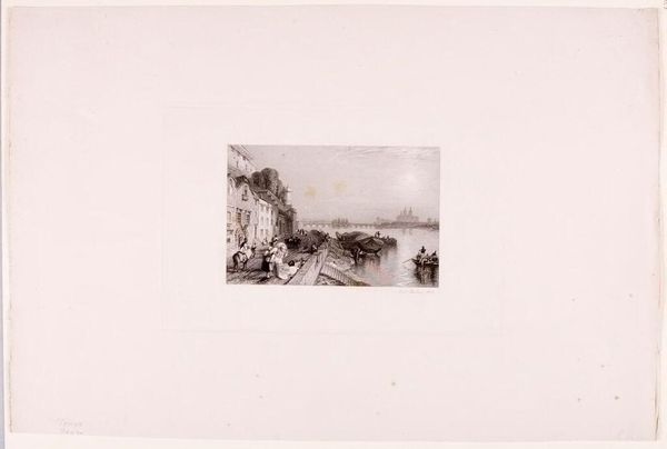 Editor: This is James Charles's "Confluence of the Seine and Marne." It looks like it's a print of some kind. The industrial presence feels very striking. What social commentary might we find in this piece? Curator: Notice how Charles positions the viewer, both in and outside of the bustling industrialized landscape. How does this liminality reflect the anxieties and aspirations of a society undergoing rapid transformation? Editor: That's an interesting point. I hadn't considered it in relation to the anxieties of industrialization. Curator: Consider the composition, too. How does the artist's choice to depict figures along the riverbank underscore class divisions and the impact of labor on the human form? Editor: I see what you mean. The figures do seem small and almost overwhelmed by the industrial landscape. Curator: Exactly! It prompts us to consider the lived experiences of those impacted by the Seine and Marne. Editor: This has given me a lot to think about regarding the intersection of art, industry, and social commentary. Curator: Indeed, understanding the historical context allows us to see Charles's work as more than just a landscape, but as a reflection of a society grappling with its own identity.