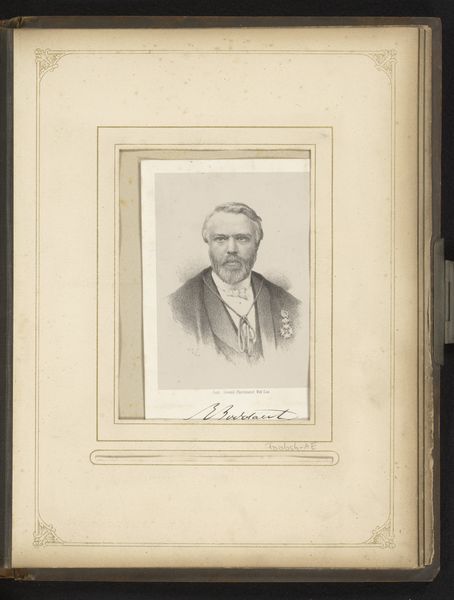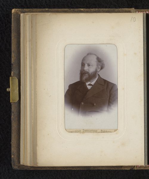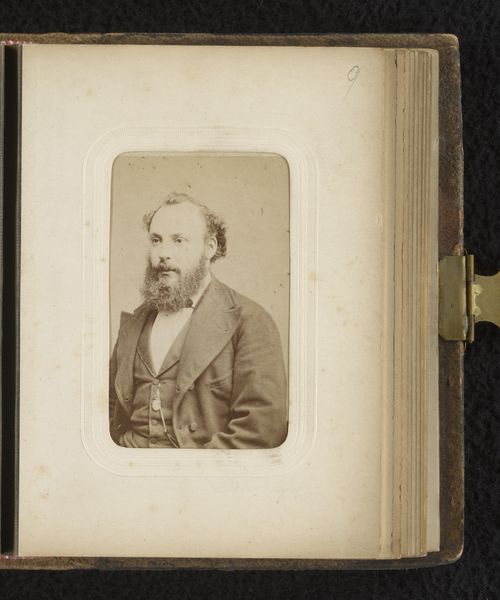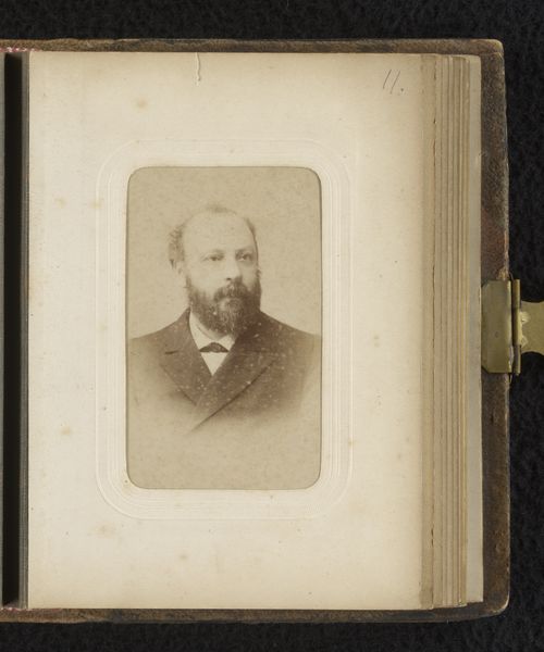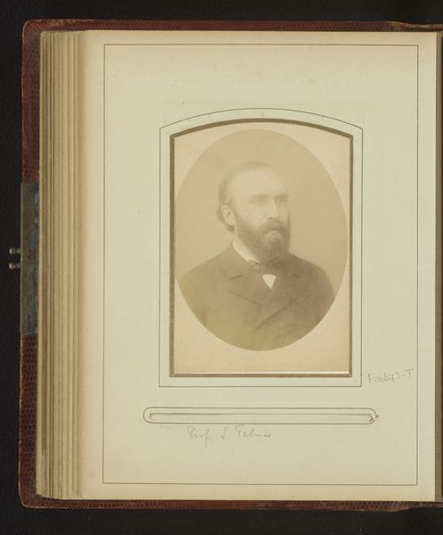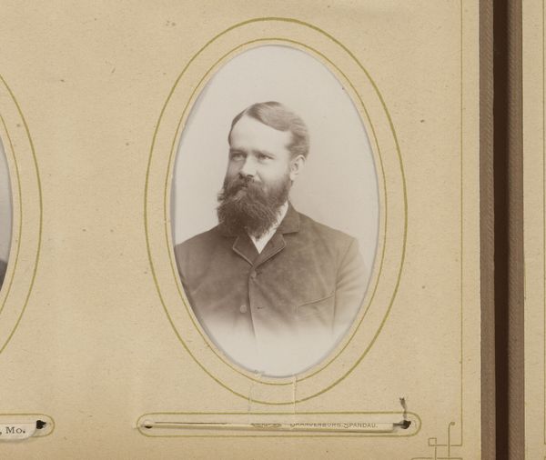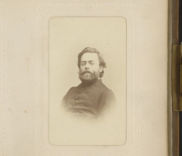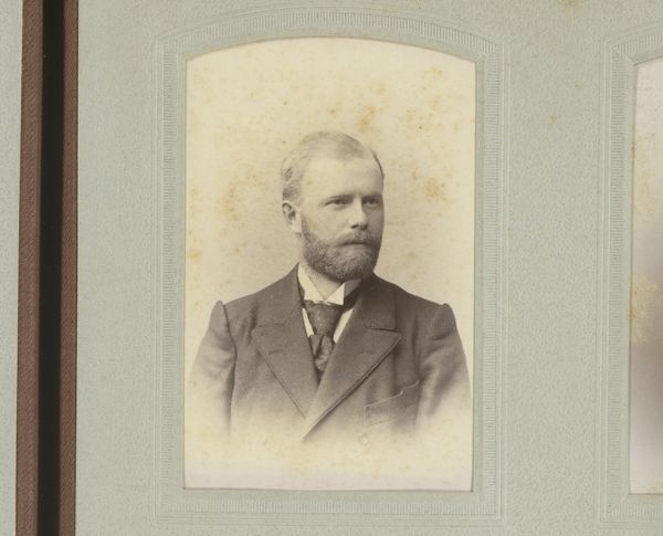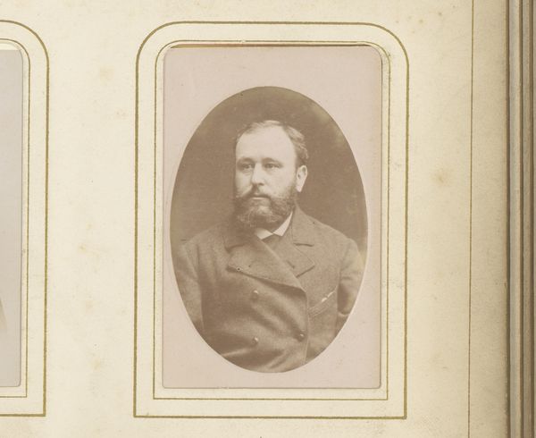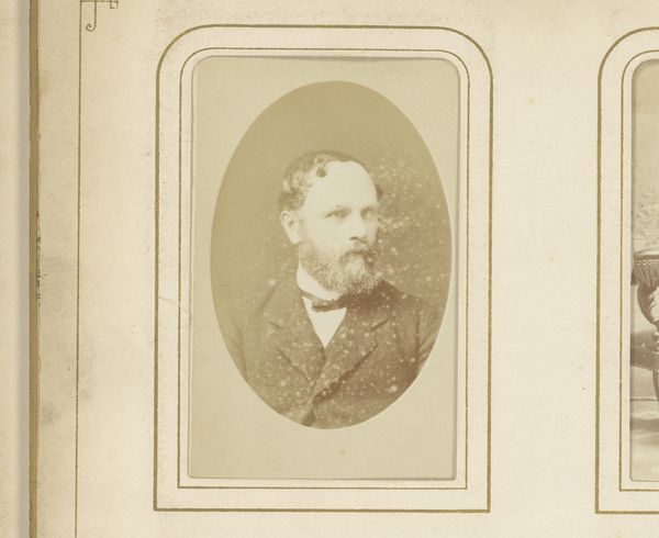 Editor: This is a fascinating portrait from between 1860 and 1900, entitled "Portret van Camille Delamour". It's an albumen print, part of a photo album. The tones are quite soft, creating a sense of introspection. What visual elements stand out to you the most in this photograph? Curator: I’m immediately drawn to the tonal range within this albumen print. Observe the delicate gradations of light and shadow, particularly how the face is softly illuminated, while the surrounding areas gradually fade into deeper tones. This careful manipulation of light contributes to the work’s expressive depth. Editor: I hadn't noticed how the blurring actually directs my gaze. How would you say the composition affects our perception of the subject? Curator: The central composition reinforces a formal presentation of the subject, Camille Delamour. The use of shallow depth of field flattens the visual plane. These elements create a balanced, formal portrait where the emphasis lies within the emotional weight conveyed through posture and facial expression. Does the framing affect your impression of its meaning? Editor: Now that you mention it, it's all starting to come into focus for me, from the shallow focus to the muted sepia tone... It’s really incredible how the composition and tonal choices contribute to the contemplative, somewhat melancholy mood of the piece. Curator: Indeed. It's a testament to the photographer’s skill in using formal techniques to evoke emotional depth and a study in capturing the aesthetic ideals of the period.