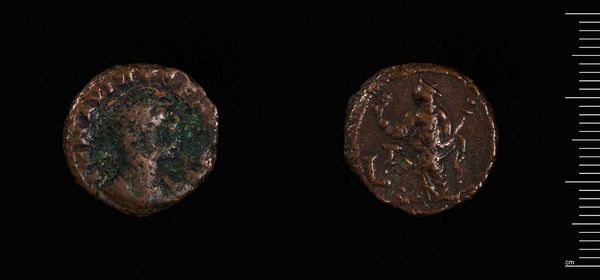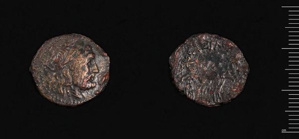 Editor: Here we have a "Coin of the Arcadian League, Megalopolis" of unknown date, crafted by the Arcadian League. The wear on its surface is so striking; it speaks to its age and use. What can you tell us about its formal qualities? Curator: Observe how the circular form dictates the composition. The raised relief, despite its degradation, still plays with light and shadow, giving the coin a tangible depth. Do you notice how the patination creates a chromatic scale from reddish-brown to green? Editor: Yes, I see the contrast now. It is incredible how the design is still legible after all this time. Thank you for pointing out those subtle, yet significant, features. Curator: Indeed. The interplay of form and decay offers a compelling visual experience.