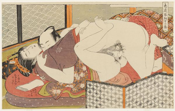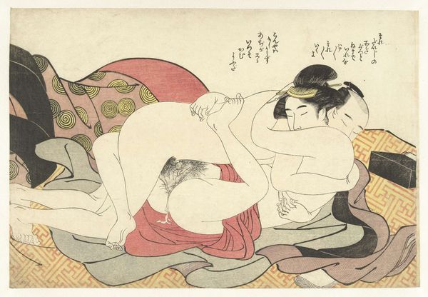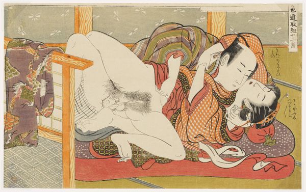 Curator: "Seamstress and her Lover," a woodblock print created by Isoda Koryūsai around 1775-1777, currently resides here at the Minneapolis Institute of Art. Editor: It’s…intimate. Immediately, the composition and the lack of pretense are striking. There's an honesty in the rawness of the depiction. Curator: Yes, that's partly the intent of *shunga*, often translated as "spring pictures," this subgenre of ukiyo-e art served multiple purposes: educational, celebratory, and even subversive. The figures are depicted as being involved in a sex act; what about the gender and social elements depicted? Editor: Look at the fine details. The woman’s garments—her kimono and the elaborate pattern on the padded cushion she’s on—suggest that, through labor or being of means, material wealth exists to the subjects involved. Notice the scattered sewing tools? What roles and labors would be prescribed to gender? Curator: Koryūsai's masterful command over the *ukiyo-e* tradition highlights the fluid lines and muted color palette of his time. His delicate attention to rendering skin tones showcases beauty. Editor: And let’s consider these "floating world" images beyond aesthetics. There is an underlying economic reality of their existence. Think of the artisans involved in production—the woodblock carvers, the printers… each print a result of collective labor, marketed and consumed. How many hands contribute to this image and its narrative of intimacy? Curator: The erotic genre of Ukiyo-e allowed the open and free depiction of human desire and was used to depict diverse genders, and served to democratize access to pleasure. The figures have an idealized appeal to their time, with smooth features that embody accepted standards. Editor: So, while aesthetically pleasing, its materiality roots us back in tangible circumstances. Consumption as both the intimate acts performed in the artwork and the material good of the image in itself. It invites us to rethink divisions—high and low art, art and craft, mind and body—demanding a holistic reading of this world created from wood, ink, labor, and love. Curator: A reminder to approach historical works like "Seamstress and her Lover" with nuance. By appreciating its artistic merit alongside its socio-cultural relevance, we gain insights that resonate in today's intersectional landscape. Editor: Absolutely. Examining an artwork's raw materiality opens pathways to critical engagement, prompting us to contemplate not only what we see but also the forces that bring it into being.