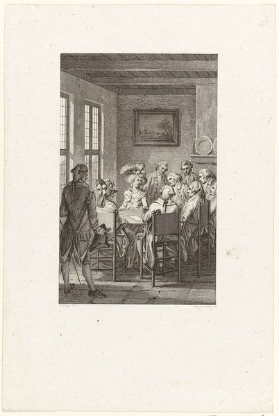 This is an engraving called ‘Raadsvergadering waarin het wonder bezegeld wordt’, which translates to ‘Council Meeting in Which the Miracle is Sealed’, made by an anonymous artist. This image reflects the intense social and political turmoil of its time, likely during the religious conflicts that marked much of European history. The gathering of these men, presumably leaders or elders, suggests a moment of critical decision-making. The nature of this 'miracle' might hint at events perceived as divine interventions or turning points during a period of strife. Consider the power dynamics within this council. The men are shown engaged in discussion, possibly negotiating complex religious and societal issues. An element of vulnerability is introduced by the dog in the foreground, perhaps symbolizing loyalty, domesticity or even neglect amid larger events. The artist captures a world in transition, inviting us to reflect on the roles of faith, leadership, and community when faced with extraordinary circumstances.