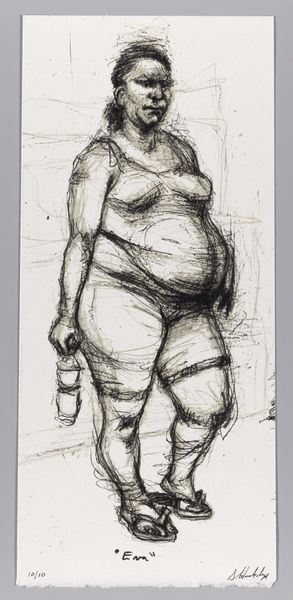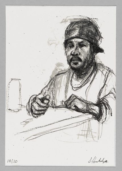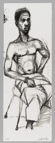 Curator: Sedrick Huckaby's piece, "99% NO.97," presents a figure with arms raised, rendered in quick, expressive strokes. Editor: The raw quality of the lines really hits me. It feels like a moment of intense emotion, a plea or maybe a demand. Curator: The inscription at the bottom, "But seriously, today, where are the fruit...Acts chapter 2," gives context. Huckaby is referencing spiritual or social outcomes. Editor: The upraised hands... It’s an ancient posture of supplication. Is Huckaby questioning societal progress or the fulfillment of promises? Curator: Perhaps both. The rapid, almost frantic, lines evoke a sense of urgency and a critique of contemporary values. Editor: Small as it is, about 12 by 7 centimeters, it’s like a concentrated burst of feeling, amplified by the reference to shared cultural memory. Curator: A potent visual shorthand for our times, then? Editor: Indeed, a small piece sparking a big conversation about faith, action, and accountability.