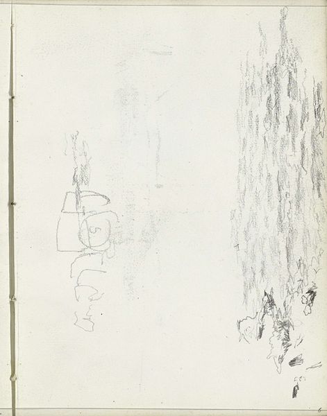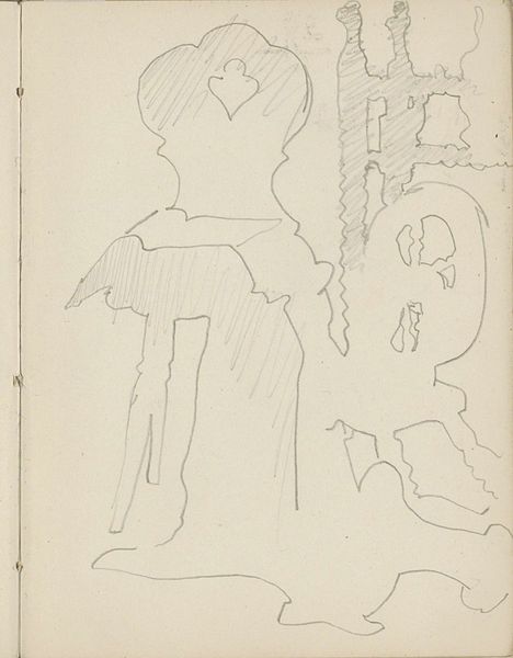 Editor: This is a study sheet titled "Studieblad, onder andere met gezichten in profiel" by Reijer Stolk, created sometime between 1906 and 1945. It’s ink on paper, and the stark lines give it a somewhat haunting feel. What elements of its composition stand out to you? Curator: Initially, the sparseness of the medium—ink barely touching paper—establishes a foundation for the analysis. We notice the strategic deployment of line. Look at how Stolk defines the profiles; there’s a deliberate incompleteness, a skeletal structure if you will, allowing the negative space to articulate the forms. Editor: I see what you mean. The profiles are only suggested. How does that contribute to its meaning, or lack thereof? Curator: Meaning isn’t necessarily the province of formal analysis, but signification is. Consider the starkness: a reduction to pure, essential line. What is emphasized by this act of reduction? Perhaps the Platonic ideal of a face, not burdened by material reality. Editor: So, rather than trying to capture the specific likeness, the artist is aiming for a more abstract or essential representation of "face-ness"? Curator: Precisely. And note the ambiguous object dominating the center of the image, perhaps some vessel; its symmetry versus the asymmetry of the faces, and its solidity against their ethereality creates an interesting dynamic, doesn't it? It draws attention to the relationships between the objects and shapes within the work itself. Editor: I do see that contrast now. It's not so much about the faces themselves, but the stark way they’re depicted, and the dialogue between all the elements. Thanks, I’ve learned a lot from focusing on those design elements. Curator: The pleasure is all mine. Approaching art through its visual construction allows for a richer experience, wouldn't you agree?