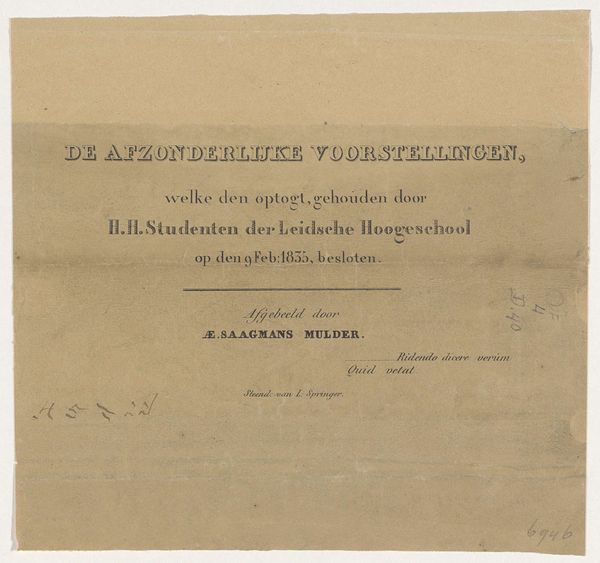 Curator: Here we have “Omslag voor de prent van het overlijden van koning Willem II, 1849,” which translates to "Cover for the print of the death of King William II, 1849." It's a lithograph on paper, created in the same year the King passed away, and it was printed by Belinfante & Co. Editor: What immediately strikes me is the weight of the typography. Those heavy, gothic-inspired fonts, announcing death, lend such a somber gravitas to the page, almost like a royal decree etched in stone. It's very formal. Curator: Yes, and if you look closely, you see that this isn't just a printed announcement. The title block feels almost hand-drawn, with its slightly irregular letterforms giving the piece an intimate quality, as if someone personally crafted each character with care. Editor: Indeed. It evokes that feeling of remembrance, but also perhaps highlights the performative aspect of mourning for a monarch. The dual text in Dutch and French reflects the complicated identity of the Dutch court at the time, no? A desire to appeal to both domestic and international audiences in a moment of national sorrow. Curator: Precisely. The stylized flourishes around the edges feel very 19th century, and echo designs one might expect from luxury items. But here they act like a frame of tears, carefully constructed for public consumption. The paper stock mentioned at the bottom suggests varied price points; mourning for every budget? Editor: Possibly so! Note the price distinction. It tells us that even grief could be commodified; where status mattered even in commemorating the deceased king. Was it seen as better to display sorrow by spending a little extra on "Chineesch" paper? Curator: Interesting to contemplate! While we interpret symbols through different lenses, seeing these lithographs gives us access to both a specific moment of cultural significance and an appreciation of enduring, almost timeless aspects of humanity—ritual, remembrance, even the commodification of feelings. Editor: Yes, and personally, I see it as a beautiful example of how graphic design can function as both historical document and powerful emotional trigger, bridging past and present through carefully chosen symbols and lettering.