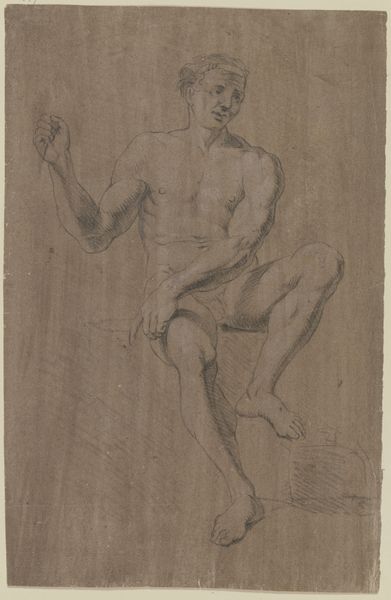 Jan Willem Pieneman rendered this nude male figure in chalk, imbuing the study with a contemplative mood. The sitter’s gaze directs us left, along the same plane as his extended arm and index finger. The arrangement produces a directional force and a sense of expectation beyond the framed edge. The rough application of chalk lends a vitality to the figure, enhancing the play of light and shadow across the torso. Pieneman’s use of chiaroscuro not only models the figure but also engages with the artistic traditions that explore dramatic contrasts between light and dark. Consider how the composition uses the sitter's contrapposto pose to create a dynamic relationship between stability and movement. The figure, seemingly caught in thought, invites us to reflect on the nature of observation and the artist's role in capturing the human form. Such elements reflect Enlightenment ideas of rationality, observation, and inquiry, which are characteristic of the late 18th and early 19th centuries.