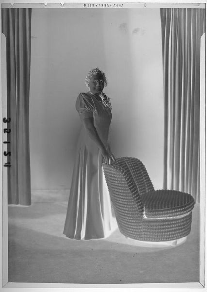 Curator: Let’s turn our attention to Senga Nengudi’s arresting photograph, “Inside Out,” created in 1977. My initial impression is of formal precision, note how Nengudi centers the figure in a plain field, activating a play of geometric shapes and tactile surfaces to produce visual complexity and spatial ambiguity. Editor: Yes, immediately I feel this sense of ritual, the figure adorned, almost shamanistic. It evokes a sense of ancient practice repurposed for a contemporary expression of identity and interiority. The stark backdrop and muted tones focus the attention entirely on the figure as a symbolic entity. Curator: Precisely, the composition allows one to focus on the sculptural elements. Nengudi utilizes commonplace materials – likely nylon mesh – manipulating it into rounded forms that drape and hang, interacting with the subject’s own body. Note, however, how she has disrupted symmetry in the piece overall. This, too, generates a distinctive rhythm, disrupting simple pattern recognition. Editor: Consider, though, the potential readings of these bulbous shapes—suspended almost like fruit, or perhaps fetishes. There's a deeply personal feeling imbued within what might seem to some like disembodied anatomical forms. The piece strikes a unique chord when thinking about femininity in relation to constructed gender. The symbolic associations feel dense and powerful. Curator: Indeed, there’s tension and ambiguity throughout, something inherent in conceptual art of this era. The tonal range and the subject's fixed gaze generate psychological depth, which pushes the piece into something more than mere aesthetic arrangement. We're meant to deconstruct its formal elements in the context of ideas, not pure aesthetics. Editor: Yet I believe those elements and aesthetic features contribute richly to its iconographic impact. Nengudi encourages the viewer to explore themes of transformation and protection of inner spirit in relation to the burdens, the physical and metaphysical impositions experienced and navigated daily. Curator: An insightful reading. Overall, "Inside Out" exemplifies Nengudi’s complex and inventive use of form and materiality. Its formal complexity contributes richly to its ability to evoke introspection. Editor: And how it weaves ancestral symbolism with the deeply felt interior experience into visual language, solidifies Nengudi's influence, challenging us to unpack the depths within.