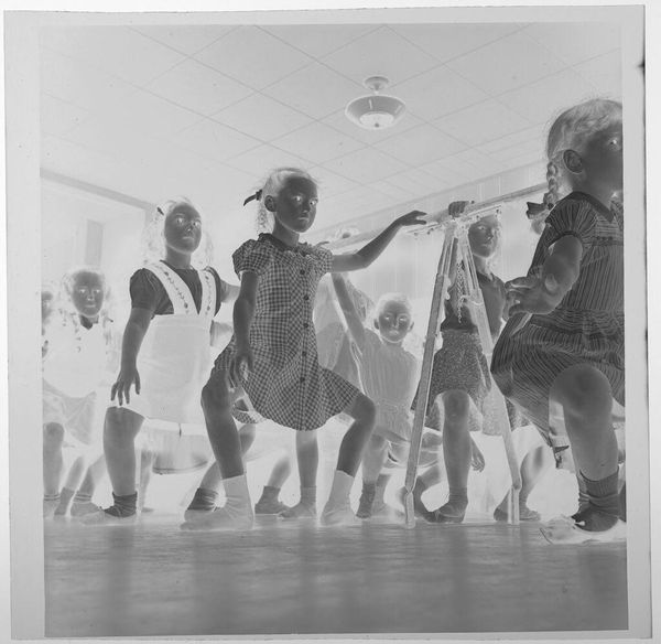 Curator: This silver gelatin print by Jack Gould presents an enigmatic scene, chimps playing baseball on a stage. Editor: The stark contrasts immediately give it a surreal, almost dreamlike quality. The figures are frozen in action, yet the composition feels surprisingly dynamic. Curator: The photograph's materiality, that is, the very process of its making, is interesting; given its small dimensions, the level of detail Gould captures is remarkable. It's a testament to the skills required in pre-digital photography. Editor: Absolutely. And consider the formal elements: the receding perspective of the stage, the textural contrast between the chimps' fur and the flat backdrop. It's a study in contrasts. Curator: I think the theatrical setting also hints at the social context, doesn't it? The staged scene invites us to think about human interactions with animals, the performance of identity and the means of photographic reproduction. Editor: I agree. It's a fascinating piece that rewards close looking. The way it plays with representation and reality leaves a lasting impression. Curator: Indeed, Gould invites us to consider the labor and performance implicit in creating an image. Editor: It's a memorable example of Gould's capacity for visual intrigue.