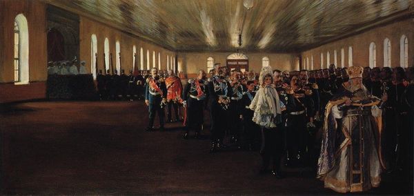 Editor: Dmitry Nalbandyan's "Reception in the Kremlin, May 24, 1945," painted in 1947 using oil paint, strikes me as a very staged and deliberate depiction of power. What is your perspective on its representation of history? Curator: It’s crucial to understand how this image functioned within the context of Soviet Socialist Realism. Consider the Kremlin, a potent symbol of Soviet authority, and the carefully orchestrated scene. This wasn't just about documenting an event; it was about crafting a very specific narrative. How does the visual hierarchy reinforce this? Editor: I notice Stalin is centrally placed and slightly ahead of everyone, but what's fascinating is the sheer number of people present, both on the stairs and observing from above. Curator: Precisely! Think about the public role of art during this period. This painting aimed to project an image of unity, strength, and the legitimacy of the Soviet regime, both to its citizens and the world. The abundance of figures signals broad support, doesn’t it? Also, note how it adopts a certain classical painting language but directed to contemporary issues. Editor: It definitely feels propagandistic, less about realism and more about idealizing the Soviet government. But were there dissenting voices in art during this time? Curator: Yes, there were movements like Soviet Nonconformist Art which offered alternative narratives, often operating underground. These challenged the officially sanctioned style and exposed the politics embedded in imagery like Nalbandyan's. Knowing about those helps to better understand just how purposeful paintings like this were in solidifying the cultural and political power. How do you now feel about the scale, the chosen setting? Editor: Understanding the historical context of Socialist Realism definitely changes my perspective. The scale isn’t just about grandiosity, it is there to reinforce the power structures within the Soviet Union at that time. Curator: Exactly! The painting is not merely a depiction, it's an active participant in shaping history and how it's remembered, especially given that Nalbandyan would go on to produce propaganda for decades to come. Editor: Thank you; thinking about how museums can challenge or reproduce that political and social power makes perfect sense now. I appreciate how history impacts visual understanding.