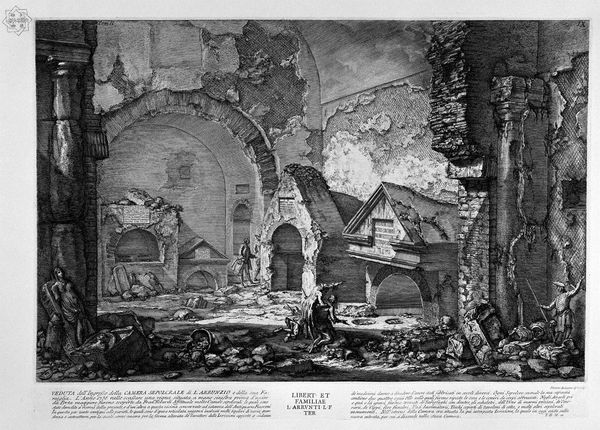 Editor: This is "Another interior view of the Villa of Maecenas at Tivoli," an etching by Giovanni Battista Piranesi from 1767. I’m struck by the scale of it, these monumental ruins. It makes me feel quite small and insignificant. What do you see in this piece? Curator: I see more than just ruins; I see a commentary on power and the cyclical nature of history. Piranesi, working in the late 18th century, was deeply critical of contemporary society, particularly the aristocracy. Look at how he renders these figures – they're dwarfed, almost lost within the grandeur of a past empire. Doesn’t it suggest a critique of present-day structures that inevitably crumble and fade? Editor: So you're saying that it's not just about depicting an old building, but about using it to make a statement about society? Curator: Exactly. Piranesi, through his architectural fantasies, dissects the mythos surrounding power. The overwhelming scale suggests a sort of suffocating weight, implying a possible struggle for individuals trapped beneath institutions or ideals. Consider, too, the popular obsession with the classical world at this time. Do you think Piranesi fully buys into the narrative of Roman glory? Or, could this ruin represent a call to disassemble or confront current oppression? Editor: I see what you mean. It makes me reconsider how the neoclassical style, usually seen as celebratory of order and reason, can also be a space for critique and questioning of current events, like some form of commentary about our identities and what remains as they fade, gender and race included, when institutions collapse. Curator: Precisely. And by doing so, he invites us to question not only the past, but our present, too. These spaces of the past help to reshape the conversations that are relevant today and that is something so valuable. Editor: I will now see more than old stones when viewing artwork of this period, and remember to always apply current theory to understand context better! Thanks!