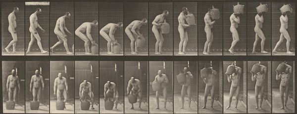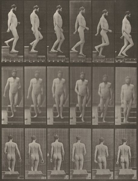 Curator: Let's turn our attention to Eadweard Muybridge's "Plate Number 183. Walking on hands and feet" from 1887, an albumen print showing a figure in motion. It’s one plate from his series "Animal Locomotion". Editor: My first impression is how this study evokes the feeling of scientific detachment—yet, at the same time, the repeating grid almost amplifies the vulnerability of the nude figure. It feels both clinical and human. Curator: Precisely. Muybridge, obsessed with capturing movement, pioneered a photographic technique, using multiple cameras triggered in sequence. Notice how he freezes increments of the human form bending, as though exploring the arc and geometry of corporeal shape. Editor: And we cannot separate this objective approach from its historical context. Remember, Muybridge sought to dissect and display motion, very often through images of marginalized bodies, extending traditions of objectification already present in the culture. Were these photographic series made to advance scientific study or something much darker? Curator: One could argue that the neutral backdrop and the grid provide objective markers for measurement, thus emphasizing his focus was not the individual but the locomotion itself. Consider the lines, the curves—it's an anatomy lesson captured mechanically, abstracting the individual almost into a set of kinetic coordinates. Editor: Perhaps, but even with this framework of 'objective science' the image reflects Victorian attitudes about the body. The very act of dissecting movement in this way speaks to attempts to catalogue and categorize humanity. I look at this and see a body laid bare to scrutiny by both science and society. Curator: I can appreciate that view. Regardless, the influence on later art movements like Futurism is undeniable; the dissection of movement, showing simultaneity. One may also suggest it reflects a philosophical approach related to Bergson’s “duration.” Editor: And further informs critical dialogues around representation and the power dynamics inherent in seeing and being seen. Curator: Well, that definitely shifts one’s attention to consider broader ethical ramifications. Editor: Art has an uncanny way of doing that!