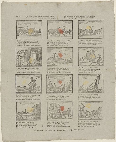 Curator: Editor: We’re looking at a printed work called “Zie hier, ô lieve jeugd! des werelds eerste stand, / Waarin de boosheid reeds vertoont de overhand,” made sometime between 1842 and 1866 by weduwe C. Kok-van Kolm, currently held at the Rijksmuseum. The piece presents, what, fifteen different little scenes? Each seems to depict a different moment, almost like panels in a graphic novel. I’m immediately drawn to the narrative aspect of it all. What story do you think it’s telling, or perhaps more accurately, alluding to? Curator: Well, aren't we the little storytellers ourselves today! The print shows different moments from the Book of Genesis - Adam and Eve, Cain and Abel... it's fascinating to consider the intent. Kok-van Kolm seems to be taking these grand biblical narratives and breaking them down into bite-sized chunks for mass consumption, perhaps as moral instruction. I wonder, does the compartmentalization change the inherent drama for you? Editor: That's a clever observation. When the scenes are presented together on one page like this, their individual intensity sort of… diffuses. Instead of feeling the weight of each individual moment, you get this overarching sense of humanity's continuous struggle with good and evil. Do you think the relatively simplistic style contributes to the piece’s accessibility, too? Curator: Absolutely! The straightforward imagery bypasses high art's perceived gatekeepers and gets straight to the heart of the story. Makes me ponder… isn't art at its most potent when it manages to be both accessible and deeply layered? Like a well-told joke! Editor: So it seems accessibility wasn't a dumbing down, but a choice in how best to approach the subject. I hadn't considered how radical that could be. Curator: Right? It really makes you think about who gets to tell the stories, and for whom.