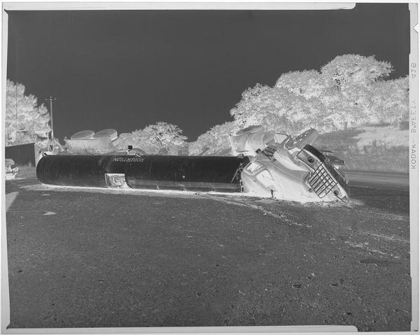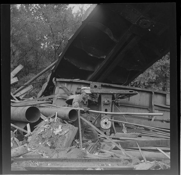 Curator: Jack Gould's small-format photograph, "Untitled (train wreck, man on track)," presents us with a stark, high-contrast image of apparent chaos. Editor: My first thought? It feels like a balancing act, a tightrope walk on the edge of disaster. The inverted tones amplify the sense of unease. Curator: Indeed. The composition is strikingly divided by the railway line, drawing the eye from the foreground figure towards the wrecked train. The tonality emphasizes the sharp angles. Editor: Absolutely. And the man, his arms outstretched, seems to be physically mediating between order and collapse. Like he's trying to keep the world from falling apart. Curator: Perhaps. Or he could be an agent of the disaster, his presence catalyzing or reveling in the destruction. The ambiguity is key, I think. Editor: I see your point. For me, it’s the strange beauty within the ruin. It really messes with my head. Curator: A fitting testament to the complexities of photographic form, wouldn't you agree? Editor: Yes. It's like the photograph itself is a kind of wreck.