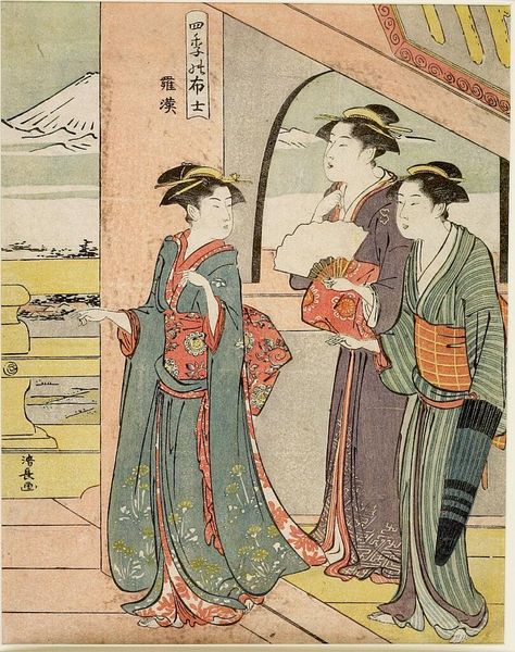 Editor: This is "Left Sheet of a Triptych of the Echigoya on New Year's Day" by Torii Kiyonaga. It’s a woodblock print. What strikes me is the emphasis on the textiles and the signage. What do you see? Curator: I see a celebration of commerce and labor. Kiyonaga highlights the Echigoya, a dry goods store, suggesting the importance of the textile industry and its workers in the Edo period. Consider the value placed on these materials and the labor involved in their production. Editor: So it’s not just a pretty picture, but a commentary on the economic engine of the time? Curator: Precisely. Kiyonaga draws our attention to the very fabric of society, quite literally. It makes you wonder about the circulation of goods and wealth represented here. Editor: I never thought about it that way. Thanks! Curator: My pleasure.