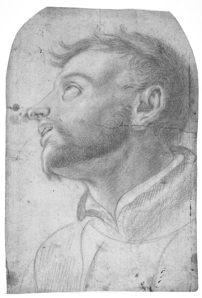 Editor: We’re looking at Albrecht Durer’s “Head of a Suffering Man” from 1503, a charcoal drawing held at the British Museum. I’m struck by the intense emotion captured, it's so palpable. What can you tell me about it from a formalist point of view? Curator: Note how the artist orchestrates light and shadow to construct a narrative of profound emotional depth. Consider the medium itself – charcoal. Its inherent fragility mirrors the ephemeral nature of suffering. How does the application of charcoal, specifically, guide your reading of the work? Editor: I guess I hadn't thought about the choice of medium, it’s not like the permanence of oil paint. The smudged lines around the eyes contribute to the sense of pain. Also, the head is cut off, close-up and confronting. Curator: Precisely. The cropped composition forces an intimacy, emphasizing the textures of skin and fabric. Observe the contrast between the tightly controlled lines defining the facial features and the looser, more gestural strokes suggesting the headdress. What might this dichotomy convey? Editor: Maybe a struggle between control and surrender? The rigid form versus the overwhelming feeling? It also creates depth – you can really feel the different planes of the face and how they sit within the confines of the frame. Curator: A perceptive reading. Durer's command of chiaroscuro, the interplay of light and dark, elevates this study beyond mere representation. Through careful attention to formal elements, Durer communicates not only an image of suffering but its very essence. Editor: I never thought of charcoal as communicating an "essence" itself. Looking closer, it seems that the tight crop combined with the drawing medium adds an overall effect of claustrophobia and discomfort to the piece, which works really well. Thanks! Curator: Indeed. Analyzing the intrinsic visual elements allows a deeper understanding of this evocative portrait.