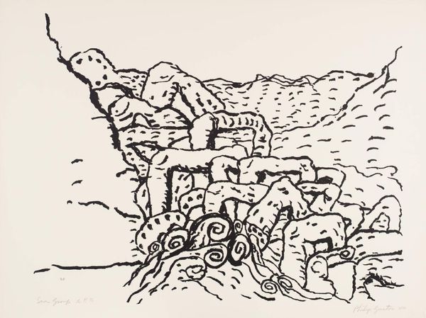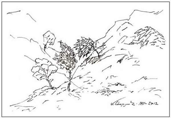 Curator: Welcome. Here we have "Armenia," a 1970 ink drawing by Martiros Sarian. Editor: Oh, my. It’s a deceptively simple, like a daydream sketched onto the back of an envelope. Mountains, suggestions of figures… the whole scene trembles with a kind of joyful abstraction. Curator: Absolutely. Sarian, though associated with the Armenian avant-garde, maintained a commitment to depicting Armenian landscapes and culture throughout his career. This piece exemplifies that, although by the 1970s his style had pared down quite a bit. We can really feel his modernist sensibilities on display here. Editor: I see what you mean. It is as though he has been chasing an impression—more interested in the emotional residue of place, memory made visible in this delicate scrim of ink. The wispy lines and near-absence of shading makes the forms seem both fragile and monumental at once. Curator: It’s interesting you mention monumentality, as even in this stripped-down form, the landscape alludes to Armenia's rich, complex history. Sarian navigated complex political landscapes himself and I see these pared-down landscapes as almost allegories, stripped to their symbolic essence by lived experience. Editor: Symbolism, yes! That's it exactly. It's funny because you can feel this grounded feeling—very specific, and maybe a little melancholy? There is something powerful about work like this when we are forced to meet art more than halfway, to create these connections for ourselves. Curator: Indeed. The power of suggestion becomes profound. It pushes viewers to connect their understanding of landscapes with their readings of histories. In "Armenia", Sarian is creating a conversation around place. Editor: What is revealed and unrevealed creates a delicious tension. It leaves me both haunted and hopeful – perfect sentiments, really. Thank you. Curator: A truly insightful interpretation. Thank you.