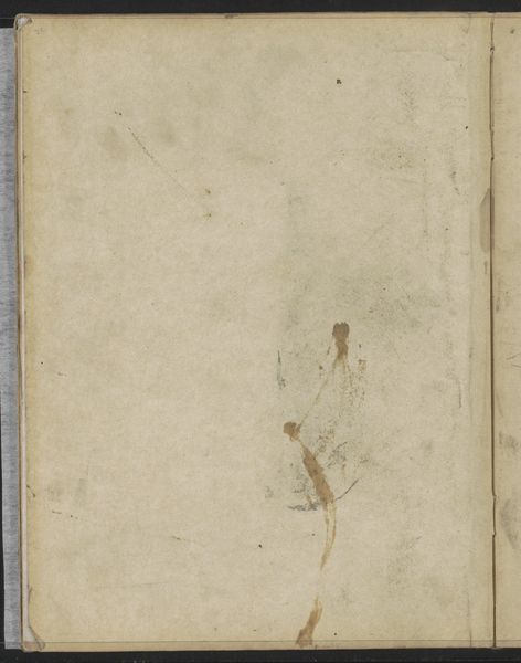 Curator: Here we have Willem Witsen’s "Abklatsch van de krijttekening op pagina 44", a work from circa 1884-1891 held here at the Rijksmuseum. Editor: Well, the most immediately striking aspect is the contrasting planes. That gray field dominating the right, juxtaposed with the subtle aged paper of the left. It feels almost like a stage. Curator: It’s more than that. Witsen, a contemporary of the Impressionists, here presents us not just with a drawing but also with its residue. 'Abklatsch' refers to a transfer or rubbing, suggesting an exploration of duplication and authenticity. The sketch book aspect shows Witsen using different papers that may or may not hold the image from one page to the next. Editor: I’m intrigued by the tonal shifts, how Witsen coaxed a subtle value range. The light and shadow interplay certainly hint at Impressionist strategies. And is that ink residue or smudging on the left-hand side, a shadow or even a vague ghostly presence of something lost or half-remembered? Curator: It also hints to me the artist's position in society at the time; they did not have fancy things. They were finding unique, efficient, resourceful ways to be artists. A sketchbook is more than just for planning paintings; it can also be a diary of the human experience during the artist's time. Editor: Fascinating. I hadn’t considered the resourcefulness embedded within the aesthetic. To me the lack of details forces my eye to wander into nothing. It does tell me so much about Witsen. Curator: Ultimately, this isn't merely about aesthetics but about class commentary using art. This speaks volumes about the socio-economic conditions framing Witsen's artistic production. It is very sad but an honest interpretation. Editor: Perhaps we can read those traces as absences and ghosts, those hints of societal barriers? But at its heart it’s a meditation on texture, tone, light, and form. Curator: I'm persuaded that we should always look past form to seek a greater reflection and consideration about culture.