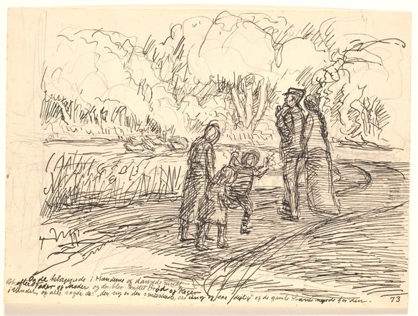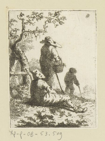 Curator: Let's discuss this evocative etching from somewhere between 1739 and 1851, “Winterlandschap met figuren,” now held in the Rijksmuseum collection. It's attributed to Johannes Janson. Editor: It immediately strikes me as desolate but also lively. The sparse lines capture the starkness of winter, but there's also a lot of movement – people on the ice, a figure observing. The material itself, the etched lines on the page, creates that chilly atmosphere. Curator: Indeed, and if we delve into the genre painting aspects, it speaks to how labor and recreation intertwine within community life. Look closely, it pictures scenes of labour that are only afforded by this cold season. The frozen canals serve a purpose outside leisure. This etching isn't merely a pastoral idyll but speaks to survival, the societal aspects that structure people's existences under difficult seasonal constraints. Editor: That is spot on! The figure with their back to us especially piques my interest. They seem separate, observing but not participating. Are they removed by choice or necessity from this winter activity? It's curious how their presence reshapes our engagement with this so called genre painting as an outsider looking in. It makes you question labour itself. What does it produce here other than precarious circumstances for other people's merriment? Curator: It raises a really critical point about marginality, doesn't it? Is he part of a working class, yet estranged? Also, the use of line becomes significant here, conveying not only the visual reality of a winter landscape but also the social realities of those existing within it, where perhaps that figure’s identity places him at a distance from community activity. Editor: Absolutely. Considering the likely audiences for prints such as these at the time, how did it portray social class? Curator: Well, these scenes were certainly consumed by wealthy households, so perhaps the intent of displaying it at home wasn't always geared toward empathy or change! Instead they became tokens for idealizing a simplified working life. It shows that there is a real potential for distortion by framing reality this way through this art form. Editor: A chilling thought, almost as chilling as the winter air depicted! Seeing the conditions people depend on in different climates really hits differently now.