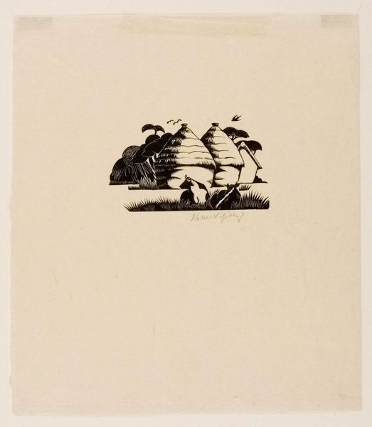 Curator: Editor: Here we have Robert John Gibbings' "Charm of Birds: Illustration Two," a striking black and white print. It feels so grounded, doesn't it? What strikes you about the materials and processes used here? Curator: The wood engraving itself is key. Its accessibility allowed for wider consumption of art, moving away from elite patronage. Notice how the stark contrast emphasizes the labor involved in carving, the physical act of making images for a broader public. Editor: That's a good point. So, the medium itself democratizes the image? Curator: Precisely. And consider the social context – were these men working, observing, or something else? It challenges us to think about labor and leisure. Editor: I hadn't considered that. Thanks, this makes me look at prints in a new light. Curator: Indeed, understanding materials connects us to the social realities of its time.