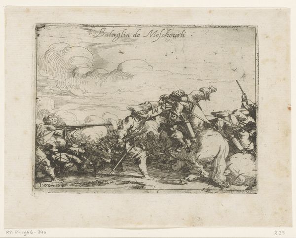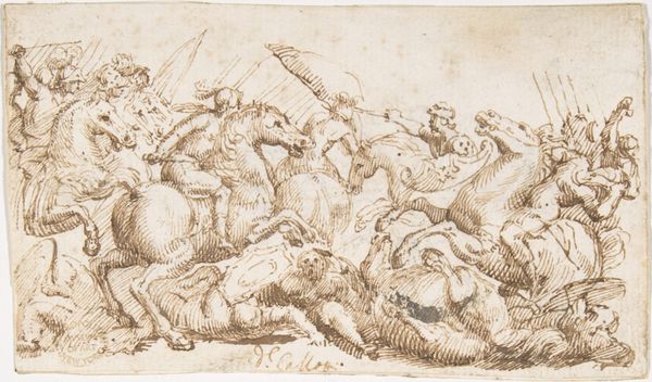 Jacques Courtois created this dynamic drawing, Ruitergevecht, sometime between 1621 and 1676, using pen and brown ink, depicting a cavalry battle. The composition bursts with energy, as figures on horseback clash in a chaotic yet structured arrangement. Note how Courtois uses line to create depth and movement. The foreground is densely packed with detail while the background fades into a more sketch-like rendering, pushing the eye back into the scene. The layering of figures and horses creates a sense of depth, drawing us into the heart of the conflict. Consider how the artist captures the dynamism of battle through the swirling lines that define the smoke and dust, and the way the bodies of men and horses intertwine. Courtois challenges the viewer to decipher the scene, destabilizing the traditional heroic narrative of battle by presenting a more visceral and confusing reality. The drawing functions as a study in organized chaos, capturing the emotional intensity of war.