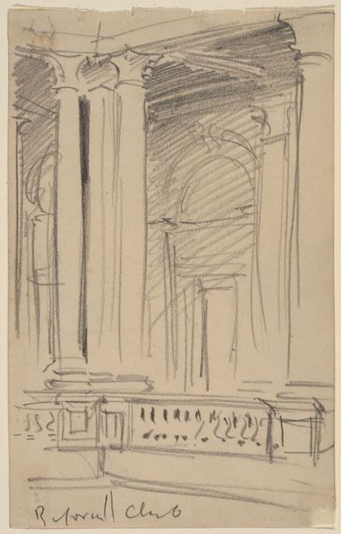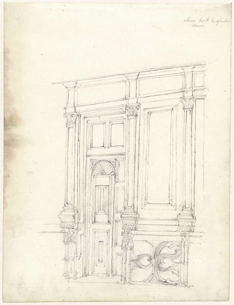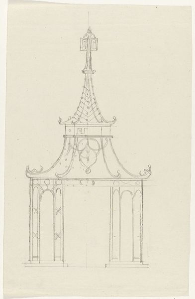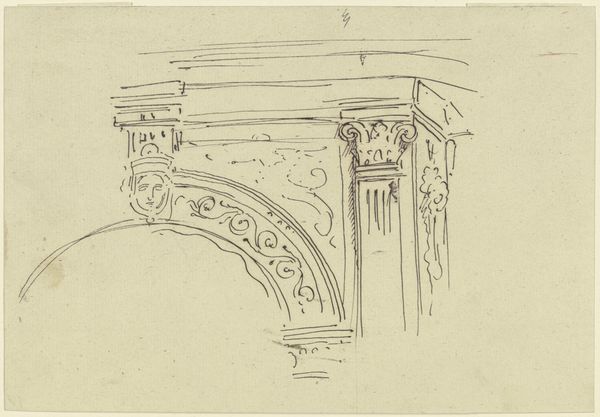 Editor: So, we are looking at "Schets van het onderstel van een tafel," a sketch of a table base by Gerrit Willem Dijsselhof, made sometime between 1876 and 1924, using pencil and pen. I'm immediately struck by how architectural it feels. It's just a sketch, but there's a sense of grandeur even in this simple design. What do you make of it? Curator: The drawing does present the functional object as if it was architecture, which certainly has resonance within the historical context of the late 19th century. We see a merging of art and craft that was very much driven by a social consciousness to ennoble everyday objects. Is it simply a sketch, or could this be a deliberate aesthetic statement about functional art? Editor: That's interesting, the idea of elevating everyday objects. It also reminds me of a temple. Do you think there is any connection to Eastern art? Curator: Absolutely. The linear style, the geometric forms, certainly evoke the kind of visual vocabulary one sees being imported and integrated into Western art from Asia during this period, particularly Japanese art. This was happening at a time of expanding global trade and an increasing Western fascination with other cultures. How might this sketch speak to a desire to create something 'new' and visually distinct? Editor: Maybe by incorporating those different cultural elements. It seems like the artist wasn't just designing furniture but trying to make a statement about art and culture at the time. Curator: Precisely! It becomes less about the table itself, and more about Dijsselhof engaging with these socio-political and artistic dialogues, using his design to subtly promote this synthesis. The Rijksmuseum holding the work further suggests its cultural value, right? Editor: Definitely! It's amazing how much can be gleaned from a simple sketch. I'll never look at furniture designs the same way. Curator: And I’ll keep wondering what the role of museum spaces is, as it is about preserving functional designs with a historic cultural impact.