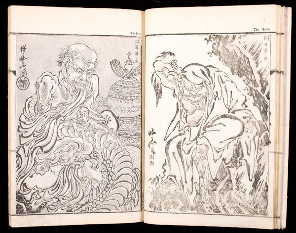Editor: Here we have a page from Hokusai’s Manga, volume 11. It seems to be a compilation of sketches in ink. The contrast between the mundane scenes and the fantastical beast is striking. What was the role of sketchbooks like these in Japanese art and society? Curator: They served as a powerful tool for cultural dissemination. Hokusai's Manga democratized art, making it accessible to a broad audience. Do you notice how the sketches capture everyday life alongside mythical creatures? Editor: I do. It's like a snapshot of society's interests. Were these sketchbooks influential on later artists and art movements? Curator: Absolutely. They inspired artists both in Japan and the West, shaping perceptions of Japanese culture and influencing artistic styles, especially in caricature and genre painting. Editor: That’s fascinating; I hadn’t considered how widely these images were disseminated. Curator: It highlights the significant role art plays in shaping cultural understanding.