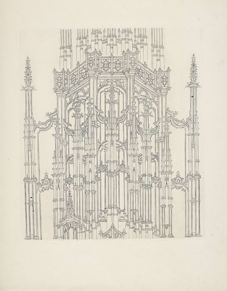 Editor: Here we have Johann Jakob Arhardt's drawing of the North Portal of the West Facade of Strasbourg Cathedral, created with pencil, chalk, graphite and ink. It's incredibly detailed! What strikes me most is the sheer dedication it must have taken to capture every tiny detail. What do you see in this piece? Curator: Well, viewing this through a historical lens, it’s important to remember Strasbourg's complex identity, particularly during periods of conflict between France and Germany. The Cathedral itself becomes a symbol of that struggle. How might Arhardt’s depiction of this specific portal, at this time, reinforce or perhaps even challenge dominant narratives surrounding the city's identity? Editor: That's interesting. I hadn't thought about the political implications. So the act of meticulously documenting a gothic structure can be more than just art, it becomes a statement? Curator: Precisely! Architectural drawings like this one played a significant role in shaping public perceptions. Who do you think was Arhardt’s intended audience? Editor: Perhaps architects or patrons interested in similar building projects? Curator: Possibly, but consider also the broader cultural context. Architectural drawings gained popularity as collectable art pieces among those interested in medieval culture during the baroque period. It became a sought after genre, with significant archival value. Editor: So this drawing existed not just as documentation, but as a cultural artifact representing the gothic style and the shifting identity of Strasbourg? Curator: Exactly! And how the meaning of gothic architecture may evolve over time and its impact on broader social and national identity in the region. This single drawing allows us a window into layers of socio-political context, cultural appreciation and how architectural form interacts with cultural significance. Editor: That gives me a completely different perspective on what I initially perceived as "just" a meticulous drawing. Thanks!