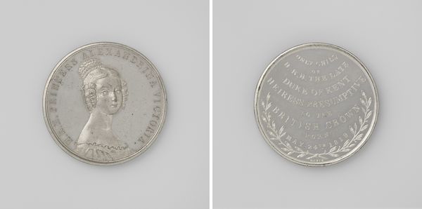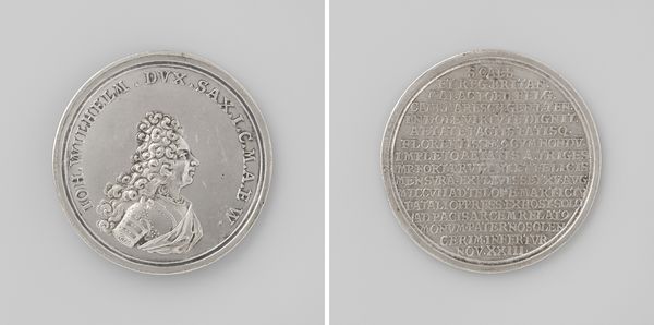 Curator: Here we have a silver medal, “Johann Willem, hertog van Saksen-Gotha sneuvelt bij Toulon,” made in 1707 by Johann Christian Koch. It's quite small. My immediate impression is how striking the details are for such a modest scale. Editor: Modest is certainly the word that comes to mind. Its form, of course, is classical, mimicking coinage or perhaps a seal. But there is something about this object as a type. What exactly *is* a medal doing in this collection? It seems more craft than high art. Curator: Consider the interplay of portraiture and inscription. The way the profile is rendered – the armor, the voluminous wig – is deliberate. These visual elements communicate power and status in a highly stylized, baroque manner. We need to understand these semiotic choices. Editor: True, but how were these signifiers manufactured, how widely were they distributed? As an object made of silver, who had access to it? Were these commemorative items or symbols of class stratification? Was Koch's choice of metal commenting on these same signifiers, and thus subverting, or embracing them? Curator: Perhaps both. I am drawn to how Koch has successfully employed relief to capture Johann Willem's likeness and to give a tactile, almost sculptural presence. These aesthetic values transcend mere function. Editor: And yet, we cannot ignore that the very nature of a medal implies function: commemorating an event and, in this case, producing meaning and consolidating power through material culture. Without context, this is just a beautifully wrought, though inherently reproducible object. Curator: Reproducibility doesn't diminish its artistic intent or execution. Its symmetries are captivating, its very shape invites focused viewing and handling, regardless of how it ended up here, a key element in unlocking the intended visual experience for its owner. Editor: And that is precisely my point: its experience *as* a circulated, touchable item must have held currency as social commentary, as an instrument of Baroque era self-fashioning and social engineering that would challenge any attempt to consider this object apart from the way the laboring bodies helped to craft its purpose and its appeal.