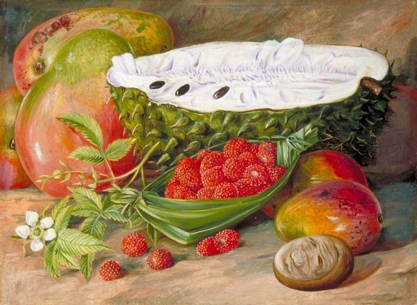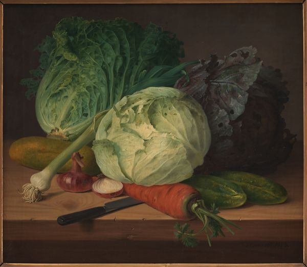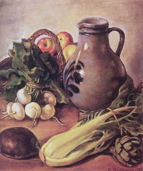 Editor: Here we have Zinaida Serebriakova's "Still Life with Cauliflower and Vegetables," painted in 1936 using oil paints. There is such a grounded feeling about this piece, the textures are palpable. What is your take on the work? Curator: The composition offers a study in contrasts. Consider the positioning of the objects. The artist sets a series of parallels, from the rough basketweave, its curvilinear form opposing the mostly sharp straight lines of carrots, radishes, and so on. Notice, too, how color balance reinforces the composition. How do you see that at play here? Editor: Well, there is a harmony in how the cooler greens and purples in the top-left basket balance the cluster of warm colors at the lower right. The folds in the white cloth give movement throughout, but overall I feel it is very traditionally structured. Curator: Precisely. Serebriakova achieves a traditional stability through a conscious arrangement of volumes. The vegetables themselves contribute to this interplay of form. The artist plays with color relationships—do you observe how the cool tones of the eggplant contrast with the warm yellows of the onions, enriching the canvas? Editor: I see what you mean about the balance of contrasts adding to the visual richness and solid composition. This artwork does seem rooted in formal elements more than making a specific symbolic statement. Curator: It is through these elements that Serebriakova elevates the still life beyond mere representation. There is such artistry within that organization.