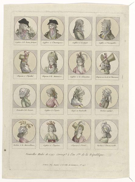 Curator: Looking at this engraving, I am struck by how ephemeral yet enduring fashion can be as a symbol. What are your first impressions? Editor: My eye is immediately drawn to the elaborate hairstyles! Each portrait seems to compete for height and extravagance, all those towering arrangements of hair, feathers, and ribbons, enclosed by austere borders. Curator: Indeed! What we are viewing is plate 227 from Gallerie des Modes et Costumes Français, an engraving from 1781, currently held at the Rijksmuseum. The artist is Claude Louis Desrais. Each coiffure is labeled by name beneath its miniature portrait. It represents a moment of great social and economic disparity in France just before the revolution, a time when fashion served as an expression of elitism. Editor: You're right, the decadence is practically screaming! And those names, evocative as titles! They seem less like descriptions of styles and more like statements of identity, performances of status and access in the late 18th century. I can’t help thinking of what these styles symbolized at the time—the exploitation of labor, the use of imported fineries while the masses suffered. The almost grotesque extravagance. Curator: Precisely. Consider how women of the era, through elaborate adornment, paradoxically showcased both power and objectification. Fashionable appearance dictated social worth. We see, perhaps, a moment where artifice became more ‘real’ than the bodies beneath these constructions. And let us remember that a culture of print helped distribute fashion ideas widely. Editor: Absolutely. The symbolic weight of each towering coiffure... the sheer quantity of signifiers, all layered on the heads of these women, seems almost satirical in retrospect. A poignant, albeit indirect, commentary on the inequalities defining their era. Curator: A fleeting snapshot, enshrined within cultural memory. Editor: And a sharp reminder that fashion is always already political, intentional, meaningful.