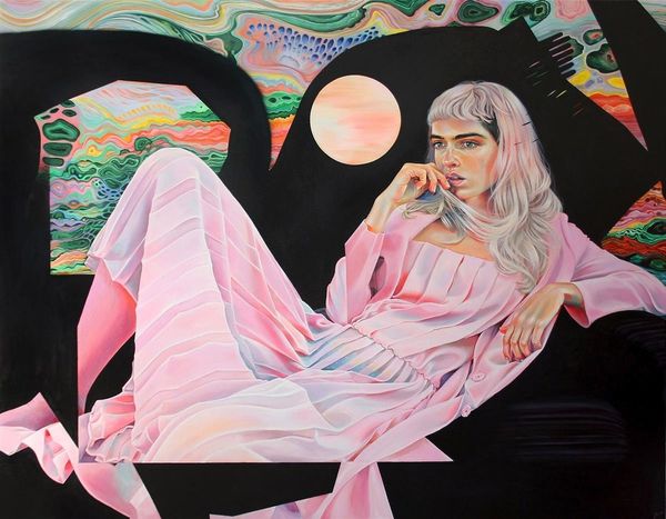 Martine Johanna’s ‘The Magic Statues’ presents three figures in a geometrically organized space rendered with lush oil paints. Notice the recurring figure, each pose suggesting a different facet of a singular identity, connected and yet distinct. The composition is constructed around a play of textures and colors. Shiny, iridescent fabrics drape around one figure, contrasting with the matte denim worn by all. This juxtaposition of materials destabilizes conventional readings, creating an interplay between surface and depth, and the real and the artificial. The background is suggestive, appearing both as an interior and an exterior space, blurring boundaries. Johanna challenges the viewer to reconsider fixed meanings, engaging with new perspectives on perception and representation. Ultimately, Johanna's use of color and texture serves a larger cultural discourse, questioning identity, and the multifaceted nature of the self in contemporary society.