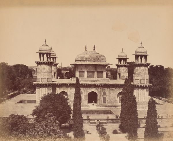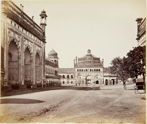 Editor: This is "Agra, Gate of the Taj," a photograph by Samuel Bourne. It captures the entrance to the Taj Mahal, bathed in sunlight. It feels timeless, almost like stepping back into history. What do you see in this piece? Curator: It whispers of journeys, doesn't it? Look at the stillness, the light playing on the gate's surface. Bourne wasn't just documenting; he was composing a story. It's a portal, really, inviting us to imagine what lies beyond, what stories that gate has witnessed. The very air seems thick with history. Editor: So, more than just a photograph, it's an invitation? Curator: Exactly! It's a rumination on time, perspective, and the enduring power of architecture. Editor: I never thought about a photograph being an invitation to imagine before. Thanks. Curator: Anytime. The art is in the seeing, isn’t it?