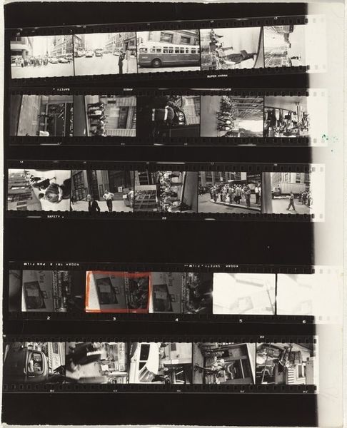 Editor: This small gelatin silver print, simply titled "Untitled (bicycles and newspaper boys)" by Jack Gould, feels like a memory. What symbolic weight do you see in the bicycles and figures frozen in this everyday scene? Curator: The bicycle, especially when linked with youth and news, often evokes a sense of speed, transition, and the dissemination of information. The negative image, however, casts a shadow. Does this not suggest a certain cultural anxiety about the rapid pace of change and the ephemerality of news itself? Editor: That's an interesting take! I was focused on the nostalgic feeling, but I see your point about anxiety. Curator: Perhaps it is both; these symbols are rarely simple. What we are left with is an opportunity to reflect upon the emotional significance of bygone eras.