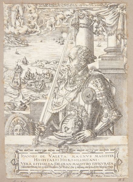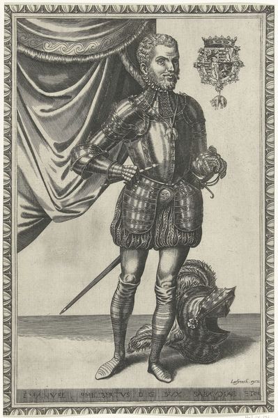 Curator: Look at the assertive detail in "40-års alderen (Wolgetan)", an engraving by Balthasar Jenichen from 1569. It's currently held at the SMK, the National Gallery of Denmark. Editor: Oh, what a curious character! He looks like a figure escaped from a deck of old cards. So formal, almost rigidly posed. What’s he guarding, or preparing for, do you think? Curator: It's interesting you say guarding. Consider the likely patrons of this print, or its function in its own era. Think about this print in multiples: How accessible it was in distribution for news, and ideas around status. Notice how much space Jenichen devotes to rendering armor? It shows great metalworking skill and attention to status. Editor: The lion, the arms, everything says "establishment." Except, his eyes seem a bit weary to me. Almost melancholy, like he's tired of playing the role. Maybe 40 years of Wolgetan feels long? Curator: Absolutely! He's literally footed within artifice, his very footing relies on the crafted lion—but is the "40-års alderen (Wolgetan)" authentic to his real personage? His stance and clothing suggests wealth and privilege and this image circulated as a form of self promotion or societal instruction for social mobility, yet he presents the gaze that hints at perhaps the opposite: anxiety. Editor: Perhaps it is, or it speaks to mortality more generally. See the castle or walled structure on the left? Such wonderful scale here; even with so many signifiers of power, you're also left with the impression of just one solitary man. It makes you wonder what occupies his mind under that helmet. Curator: Or maybe consider what role this etching played in self fashioning within Renaissance social circles! Thanks to art and material reproducibility— the consumption of luxury signifiers made statements to larger audiences of status anxiety Editor: The detail is so captivating! I appreciate seeing these things as "a means of display". Curator: It certainly offers us a lot to consider! Editor: It certainly does!