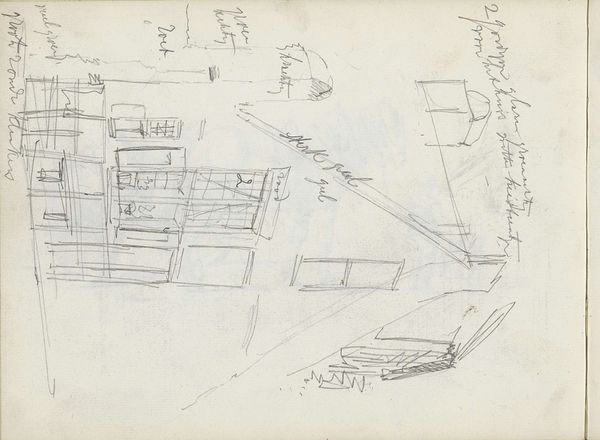 Editor: Looking at this sketch, I’m immediately struck by how intimate it feels, like stumbling upon someone's daydream made visible. There's a quiet intensity to the way these lines dance across the aged paper. Curator: We are viewing "Plattegrond van een huis", or "Floor Plan of a House," a drawing created between 1890 and 1946 by Cornelis Vreedenburgh. The work, rendered in pencil, gives us a glimpse into architectural thought processes during this period. Editor: It's so raw, you know? Almost like a map of a mind rather than just a blueprint. I find myself wondering who inhabited this imagined space. Curator: Absolutely. We must consider how evolving ideas of domesticity were shaped by intersecting cultural and social norms during the late 19th and early 20th centuries, including notions of privacy, class, and family structure, all impacting architecture. How might Vreedenburgh's own position influence this creation? Editor: That makes me wonder—did Vreedenburgh intend to create a physical space or just to create art, do you think? Did they imagine how life might inhabit it, how stories would unfold? Curator: This opens avenues to consider not just the physical dimensions, but also the lived experiences a structure might contain, mirroring contemporary feminist critiques of space, where architecture isn't neutral, but coded. Editor: Yes, the scale feels off somehow...it makes me consider issues like access, affordability, even the politics of land. Curator: Precisely. So even what seems to be just an "initial sketch", prompts us to confront these realities. Editor: This image truly becomes a space for dreaming, doesn’t it? Thanks for letting me roam around these mental rooms with you. Curator: And for me it re-iterates how important the space where architecture, art, society and politics coincide is to the study of any artwork.