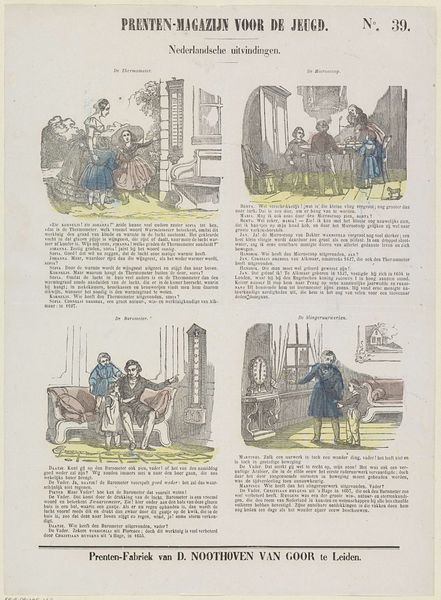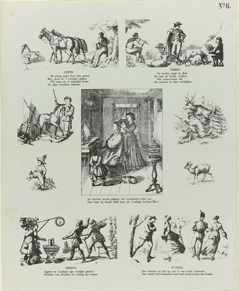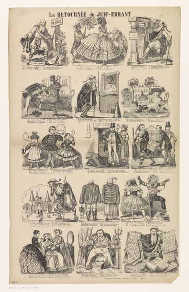 Editor: This is "Wat moet gij worden" by Dirk Noothoven van Goor, made sometime between 1850 and 1881. It looks like a print with different sketches, almost like a comic strip, each showing a person in a different profession. What strikes me is how each figure is presented within its own little frame. How do you interpret this work? Curator: This print offers itself up for formal analysis due to its graphic quality. Each individual frame represents a microcosm. Consider how each miniature stage uses line, form, and composition. What can we understand from this use? Editor: Well, the consistent use of line creates a sense of unity across the different vignettes, despite showing disparate subjects. It reminds me of earlier book illustrations, almost, except this feels more economical in its design and presentation. Does that mean anything? Curator: Precisely. And that is important to consider; the deliberate choice of this stripped-back composition focuses our gaze purely on the characters and their actions. Are we distracted? No. Each trade or occupation is carefully illustrated to foreground labor itself. Are they romanticized, would you say? Editor: Not really, the rendering is too matter-of-fact. They're just shown doing what they do, without idealization. It is very… direct. Curator: Agreed. Now, think about that directness and lack of adornment relative to the historical context of its making, its design. Where might one position the image on a spectrum, conceptually? Editor: That’s a good question! It sits more like a social commentary than just an occupational guide for children. It feels almost… critical. Curator: Indeed. Paying close attention to such graphic presentation brings us into closer proximity with Noothoven van Goor’s social considerations. Editor: I'll certainly look closer at the compositional aspects of similar works now! Thanks!