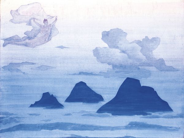 Editor: Here we have Nicholas Roerich’s “Oirot Messenger of the White Burkhant,” an oil on canvas from 1925. There’s a palpable sense of mystery here; the subdued palette really gives it a dreamlike quality. I'm curious, from your perspective, what are the key compositional elements that stand out? Curator: Observe the layering of the mountain ranges. Roerich masterfully uses graded hues of blue to construct depth, which is only interrupted by the placement of the yellow disc hovering above as the moon. And note the figures - they’re almost spectral, aren’t they? The artist seems interested in forms and planes in the composition to generate atmospheric perspective. How does this use of colour impact your perception of the artwork? Editor: It's fascinating how Roerich uses colour to convey distance and also atmosphere. The limited range makes everything feel connected, part of the same environment. The horse and rider appear illuminated, contrasted to the shadowed figure sitting on what seems like an outcrop. I’m just thinking, could you unpack a little how those colour choices might affect how we see the symbolism within this? Curator: Indeed. The coolness, that blue tonality across the canvas, subdues the forms. There are suggestions of Romanticism. Ask yourself: Does the lighting add to a sense of melancholy or hope? Or something else entirely? Editor: It definitely emphasizes the sublime quality of the landscape, making the human figures seem small and, well, fragile. Curator: Exactly. Note how the details aren't rendered with hyperrealism but are implied, which only reinforces the overall symbolic effect, especially with that solitary figure in the foreground and its back to the mountain range behind. Roerich seems less interested in historical accuracy than symbolic resonance. Editor: I’m understanding how important the construction and perspective are for conveying meaning. Curator: And how meaning can arise even without being explicit. Colour and form become carriers of emotional and even spiritual weight. Editor: I’ll certainly look more closely at colour temperature and layering from now on. Curator: As will I. Thank you for drawing my attention to those forms, so very important for generating atmosphere.