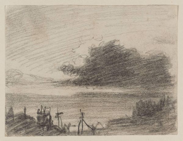 Curator: Isn't that brooding? It's like looking at the soul of a landscape holding its breath. Editor: We're viewing "Before the Thunderstorm," a pencil drawing created by Isaac Levitan in 1893. Note the masterful use of line. Curator: Those clouds! They’re not just clouds; they’re a dramatic event waiting to unfold. I can almost smell the ozone, feel the sudden drop in temperature. Does it remind you of anything personal? For me, the drawing triggers my anxiety whenever I forget my keys while leaving home and anticipate impending doom. Editor: Indeed, the artist expertly contrasts the texture and mood. The ominous sky bears down with dense, smudged shading. The detailing in the church buildings in the foreground suggests an intersection of temporal anxiety with spiritual stability. Curator: Spiritual stability... hmm, you see it that way? I guess, there is also something profoundly still in the face of an impending storm. Editor: Absolutely. But the way Levitan has composed it creates this… dynamism in stillness. This horizon—this line is key. The Romantic undertones are quite evident. Look at how Levitan subtly guides our vision—there is visual weight everywhere! Curator: Exactly. And for me, it is more about emotional heaviness. He wasn't just documenting what was in front of him; he was filtering it through some deeply personal lens. Like he wasn’t simply drawing what he saw but conveying what it *felt* like. Editor: Perhaps that tension makes the drawing endure, though. It becomes more than a mere landscape study; it transcends the material limitations of pencil and paper to capture a fleeting moment charged with psychological depth. Curator: In essence, Levitan has bottled the moments *before* the release of pure raw emotion into this compact image. Wonderful! Editor: Precisely. The restraint is, arguably, what amplifies the dramatic impact. It's an economical yet evocative work, I'd say.