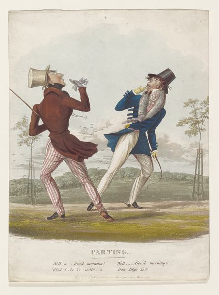Curator: Before us is a genre painting attributed to an anonymous artist from the 18th or 19th century, titled "Three French Soldiers on a Road," currently residing here at the SMK. The work is created using gouache and watercolor on paper. Editor: My first impression is one of contained chaos. There’s a tension in the body language—gestures flying every which way—yet the restrained palette and tight composition keep it from feeling truly frantic. Curator: It's intriguing how the artist captures a sense of immediacy. Genre paintings from this period often provide insight into daily life, reflecting the social climate of the time. We see, perhaps, a commentary on the role of soldiers within civilian society during this turbulent period in French history. The Romantic undertones seem to invite viewers to invest these figures with some humanity, something which might otherwise be denied in their role as invaders, depending on where the viewer of the time happened to be positioned. Editor: Visually, it is the play of lines that truly commands attention; consider the bold diagonals created by the muskets contrasted against the delicate, almost ethereal wash of the landscape behind. Then we see a wonderful tonal shift to that rugged log foreground, almost thrust into our personal viewing space. What do you think? Is it intentionally jarring, do you feel? Curator: Well, contextually, one might argue that juxtaposition intentionally throws the military figures into stark relief against a common scene. That it implies, for example, that even on a mundane road the apparatus of military rule remains heavily present and imposing on the population at large. It’s a powerful statement. Editor: Perhaps so. However, my reading lingers more with the application and combination of medium; the opacity of gouache allows for striking details in the soldiers' uniforms, their faces. It gives way at the edges to soft watercolor washes in a surprisingly elegant treatment of the overall landscape. It really highlights a sense of temporality, you know? Fleeting gestures almost on the verge of fading away. Curator: Fascinating. It underlines, perhaps, how art becomes a means for re-evaluating, indeed even interrogating social and political issues. It certainly makes you wonder what debates such art spawned when it first appeared. Editor: Absolutely, and isn't it precisely such ambiguity of artistic intent that continues to enthrall us, and draw viewers back? Thank you!