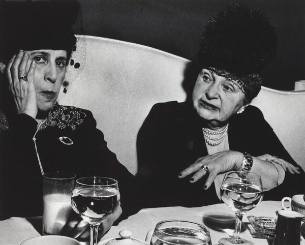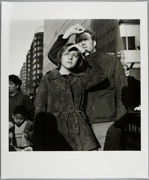Curator: This black and white photograph, "Tokyo, 2003, at Shinjuku Station," possibly created between 2003 and 2014, is the work of Leo Rubinfien. I find it fascinating how the artist captured this very fleeting, seemingly unposed moment. Editor: Immediately, I feel the weight of unspoken history, like observing characters from a Kurosawa film dropped into the frenzy of modern Tokyo. There's an undeniable gravity in their faces, beautifully etched by time and experience. Curator: It's true, isn't it? Look at the texture – the tangible surfaces of their clothes, the almost granular quality of the photograph itself. This work engages with a legacy of street photography while simultaneously acting as social commentary through capturing everyday encounters. How do their clothes position them economically, for instance? What is their age bracket? Editor: Yes, the sharp focus emphasizes this too. I think about where the photographer chose to position themselves within a bustling commuter station. The result almost looks like we’ve invaded an intimate moment. But you know, beyond the technical aspects, there's something quite soulful here. It captures this intense humanity in the most ordinary of spaces, as they perhaps look up to the source of the sound from the photograph. Curator: That juxtaposition—soulful intimacy within a busy hub—is a potent theme in a modern society constantly bombarded by fleeting, alienating moments. We see this attention to the everyday also in photography by artists like Walker Evans who elevate a specific time or location to high art. This elevates a slice of life from Shinjuku station to our consciousness. Editor: It's a stark reminder to find the extraordinary even within our commutes. Looking at how they wear their garments, their buttoning, hat and glasses placement -- even that feels deeply, deeply intimate. Curator: Agreed. By utilizing monochrome film and seemingly candid composition, Rubinfien draws us in and makes us question: How many untold narratives surround us every day? Editor: It’s like catching a glimpse into a story unfolding right before your eyes, leaving you both intrigued and humbled. The more I ponder it, the more layers seem to reveal themselves.