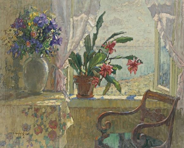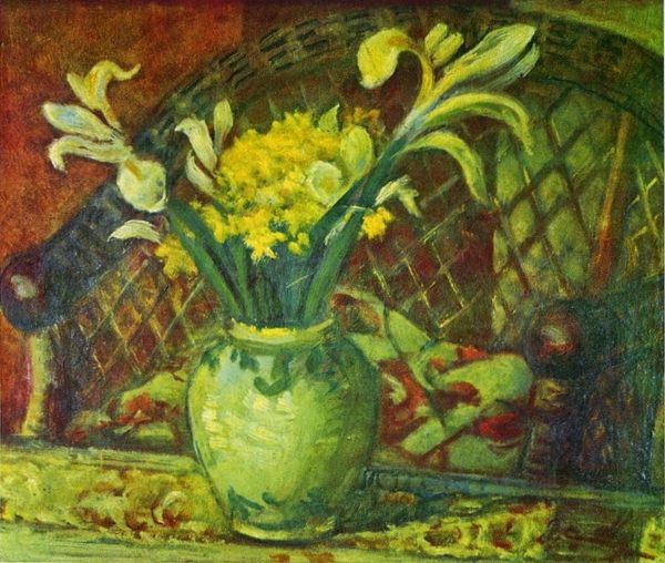 Curator: Pierre Bonnard’s "Pitcher," created in 1931. It exudes a soft, dreamlike quality. The colours feel muted. What are your first impressions? Editor: The impasto technique draws me in. The thick application of paint makes the whole scene almost tactile, emphasizing the materiality of the artwork. The painting displays an interest in capturing fleeting, domestic moments, rendered here in textured layers of oil. Curator: Bonnard was, after all, part of the Intimist movement. These artists celebrated everyday, intimate scenes within the domestic sphere, which can be deeply influenced by patriarchal social standards. It is difficult to talk about domesticity without discussing gender roles. Editor: Yes, and I see how Bonnard’s artistic choices reinforce certain power structures. The rough texture implies the labour and process inherent to its making; a kind of physical expression of craft. The way the flowers are haphazardly arranged—that choice feels crucial too. Are they store-bought or foraged? And who is arranging them? Curator: Right, those considerations absolutely bring more substance to it! What kind of value systems does that imply when domestic floral arrangements might reflect cultural attitudes regarding gendered spaces? What kinds of materials and products were affordable at the time to specific people? These things matter, but, more directly, what do you suppose Bonnard's message was to viewers at the time? Editor: I wonder, with all that expressive paint, whether the painting aims to reveal the tangible, worked surface more than it wants to create some mimetic illusion. In focusing our attention on the texture, we see the means of production upfront, so we are perhaps meant to recognize art as labour itself. Curator: In seeing labour we may gain an elevated appreciation, but also remain cognizant of all other types of invisible labour. This connects the artist’s intimate life and artwork, along with those viewers immersed within contemporary cultural frameworks. Food for thought, no? Editor: Definitely, examining both production and intention through their materiality can definitely uncover various perspectives!