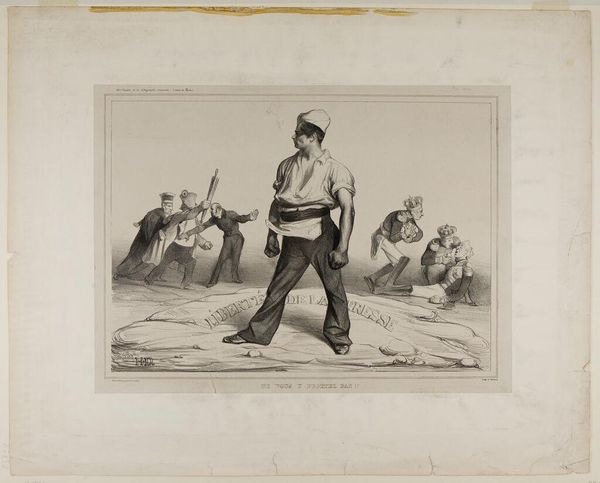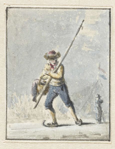 Curator: This small print, titled "Late for Roll Call," presents an anonymous artist’s view of military life. The piece measures just over 10 by 6 centimeters and resides here at the Harvard Art Museums. Editor: It has a desperate, almost comical energy. The foreground figure, struggling with his boots, creates an amusing contrast with the chaos of the figures rushing toward formation in the background. Curator: The artist certainly uses a visual language of urgency. Note how the diagonal lines formed by the running figures and the tent’s structure all converge, directing the eye towards the distant roll call. It’s quite effective, even on this small scale. Editor: Absolutely. And consider the deeper symbolism—the vulnerability of the half-dressed soldier juxtaposed with the rigid discipline demanded by military order. It speaks volumes about individual struggle against institutional power. Curator: One could also view it as a study in contrasts between stillness and movement, order and disorder. It transcends its seemingly simple subject matter. Editor: Indeed. It's an easily accessible image, yet it opens a window into universal themes of duty, pressure, and the ever-present human struggle.