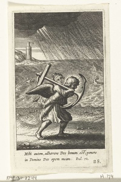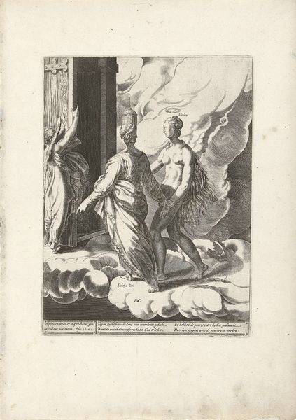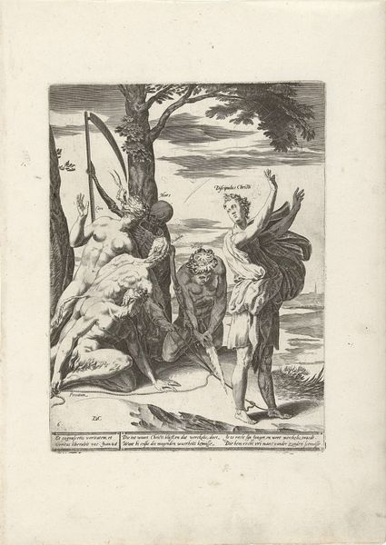 This engraving, by Dirck Volckertsz Coornhert, presents a complex allegory rendered in fine detail. The composition divides roughly into earthly and celestial realms, with sharp lines etching out figures and landscapes. The dominant figure of Truth stands over the vanquished forms of Desire and Falsehood, an arrangement that conveys a clear moral hierarchy through spatial relationships. Notice how Coornhert uses contrasting textures to differentiate the figures. The smooth, idealized body of Truth contrasts sharply with the contorted forms below, highlighting a tension between virtue and vice. The stark, linear style typical of engravings emphasizes clarity and precision, aligning with the didactic purpose of allegorical art. The landscape in the background, with its distant city, adds depth but remains secondary to the foreground drama. Coornhert utilizes line and form not just to depict, but to argue for a triumph of reason and honesty over deceit, reflecting the philosophical currents of his time.