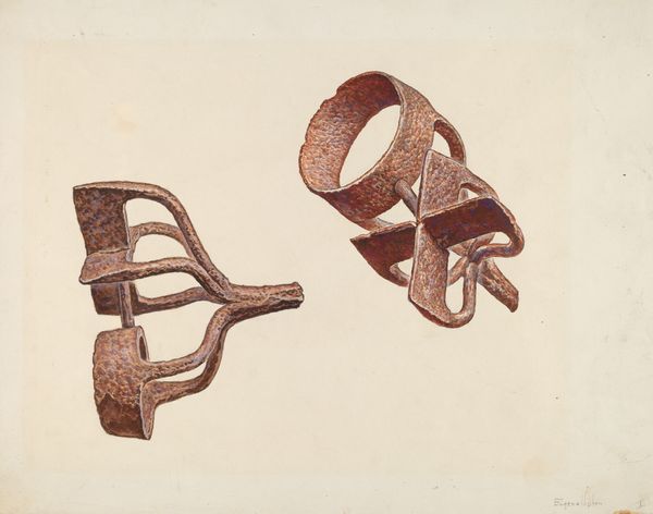 Curator: We’re looking at Hal Blakeley’s “Headstall,” a watercolor and drawing from around 1940. It’s a surprisingly detailed rendering of… well, a horse’s headstall. Editor: My first thought is how meticulous it is. It feels very objective, like a scientific illustration almost. There's a crispness, despite it being watercolor, and this meticulous detail speaks to a certain type of knowledge of horsemanship and gear. Curator: Absolutely. Blakeley clearly understood the craftsmanship behind these objects. Think about the history embedded in each piece of tack; the cultural significance of horses in the American West; how the horse played a role in conflicts between settlers and indigenous populations; its role in the economy. All of that comes into play when we look at a seemingly simple drawing like this. Editor: Right. The ornamental silver detailing – it speaks to something beyond pure utility. Was this intended for show, or daily use? And how might those uses reflect social stratification and gender dynamics within that Western context? It makes me wonder about the cultural values embedded in these types of objects that blend artistry and practicality. Curator: Exactly! And Blakeley wasn’t just passively documenting something. Artists often responded to popular portrayals of the West, some reinforcing myths, others challenging them. Consider how an artwork like this fits into narratives of progress and domination or subversion. Editor: I agree. By portraying something as functional, like this headstall, it raises questions about what and who gets romanticized and mythologized in the story of the West. Curator: Indeed, looking closer we can trace the complex relationship between objects, power, and identity construction. Editor: Well, Hal Blakeley’s "Headstall" gives us something to consider, and reconsider! It prompts questions about history and labor when simply portraying the functional beauty of western ornament. Curator: A seemingly unassuming drawing really, until we peel back the layers, isn’t it?